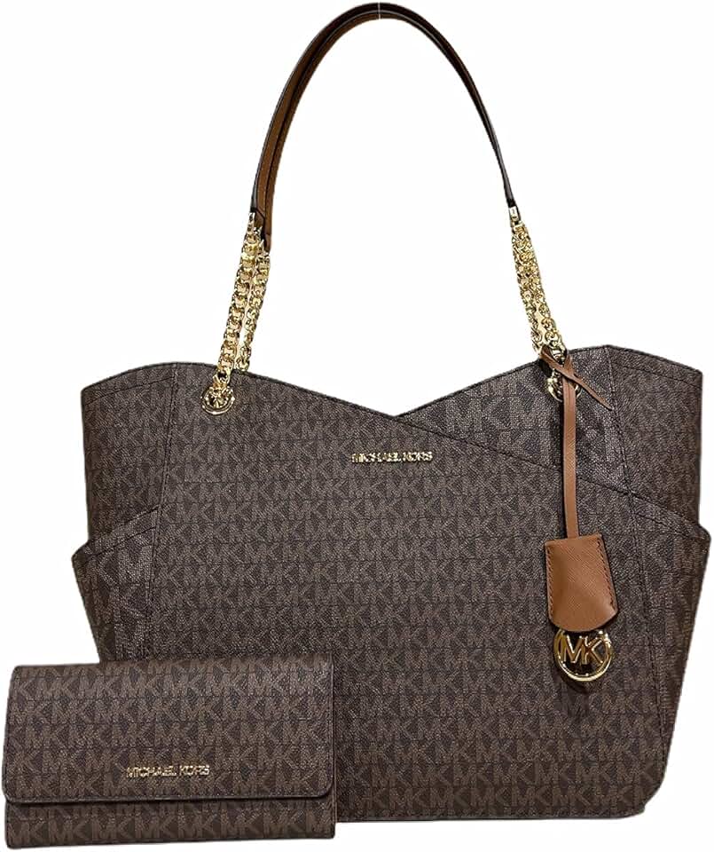 Michael Kors Jet Set Travel Large Chain Shoulder Tote bundled with Trifold Wallet (Brown MK 2021)