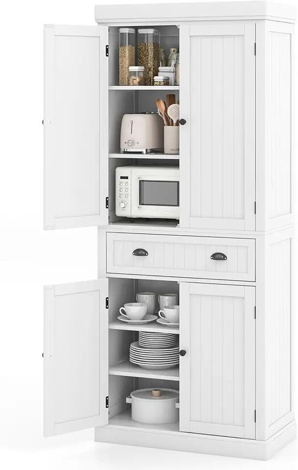 Nightcore, 1 Kitchen, 6ft Cupboard w/ 4 Adjustable Shelves, 2 Wood Pantries, Drawer, Utility Storage Cabinet for Hallway, Living Room, Bathroom, White