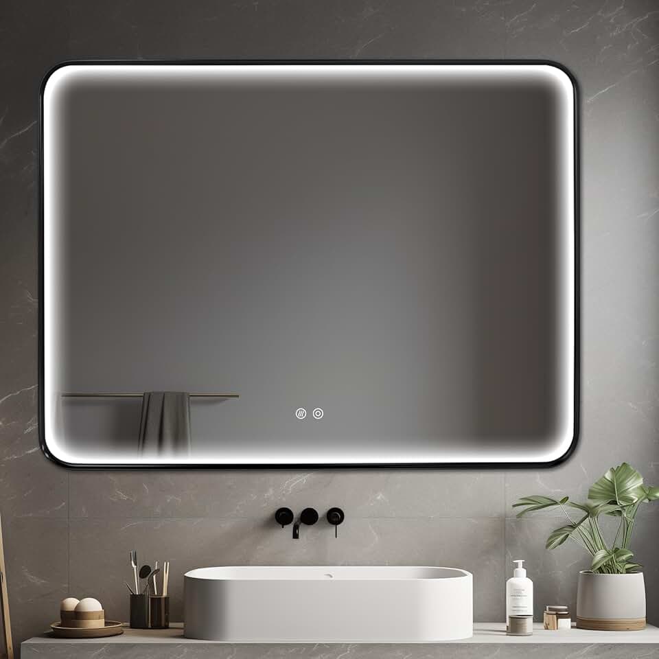 Niccy 40"x30" LED Bathroom Mirror, Black Metal Framed Mirror with Memory Function and 3 Color Adjustable Rectangle Anti-Fog Wall Mounted Makeup Shaving Vanity HD Smart Rectangular Mirror