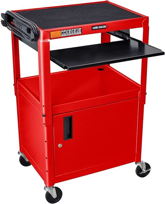 LUXOR AVJ42KBC-RD Steel AV Cart with Adjustable Height, Storage Cabinet and Keyboard Pullout Tray, Red