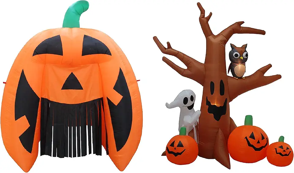 TWO HALLOWEEN PARTY DECORATIONS BUNDLE, Includes 8 Foot Tall Inflatable Pumpkin Monster Archway Arch, and 8 Foot Tall Inflatable Dead Tree with Owl Ghost and Pumpkins Outdoor Indoor Blowup with Lights