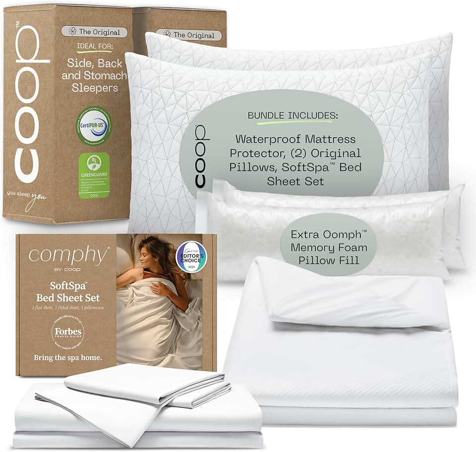 Coop Mattress Protector, SoftSpa Sheet Set & Original Pillow King Bundle, Set Includes (1) Ultra-Tech Mattress Protector King, (1) SoftSpa Sheet Set White King and (2) Original Pillows King