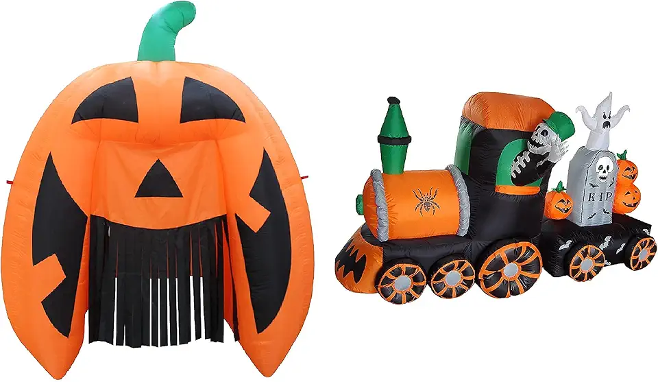 TWO HALLOWEEN PARTY DECORATIONS BUNDLE, Includes 8 Foot Tall Inflatable Pumpkin Monster Archway Arch, and 7 Foot Long Inflatable Skeleton on Train Ghost Tombstone Pumpkins Outdoor Blowup with Lights