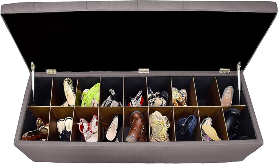 Button Tufted Shoe Ottoman Storage Bench for Bedroom or Entryway, Adjustable Wooden Inserts, Stores up to 36 Pairs, Easy-Open Hinged Lid, Large, Grey with Red Tint