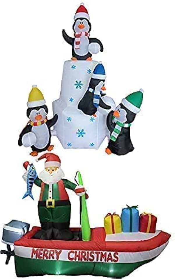 Two Christmas Party Decorations Bundle, Includes 8 Foot Long Inflatable Santa Claus on a Fishing Boat, and 8 Foot Tall Inflatable Penguins Family Playing Snowballs in The Snow Blowup with Lights