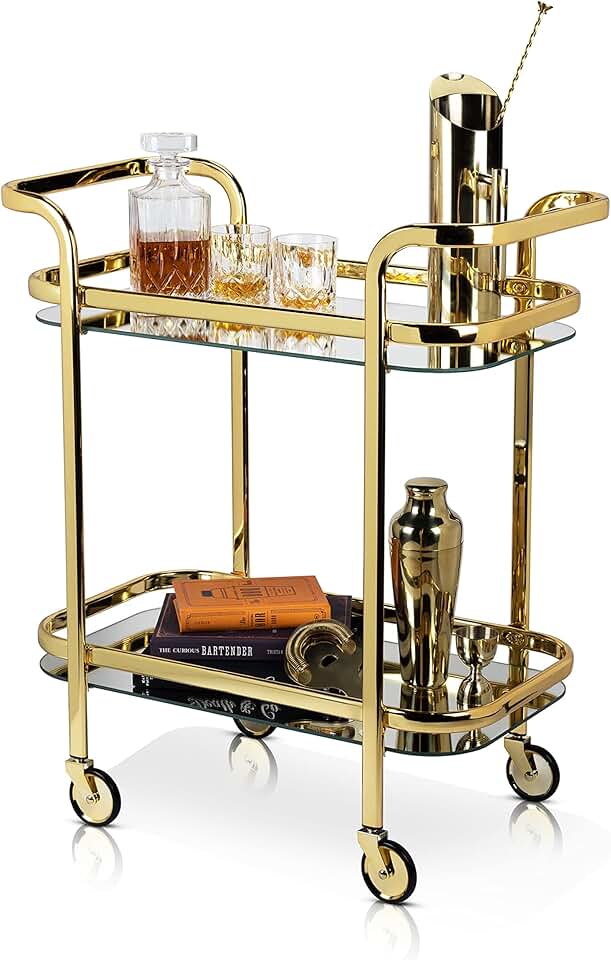 Viski Kitchen and Bar Cart with Wheels and Mirror Shelves, Kitchen and Bartending Accessories Holder, Stainless Steel, Gold Finish
