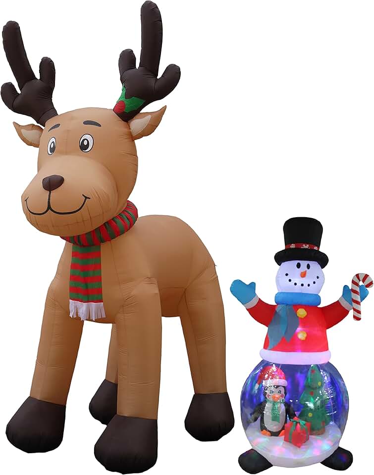 Two Christmas Party Decorations Bundle, Includes 15 Foot Christmas Inflatable Reindeer Decoration, and 8 Foot Tall Christmas Inflatable Snowman Globe with Penguin and Gift Box Christmas Tree Blowup