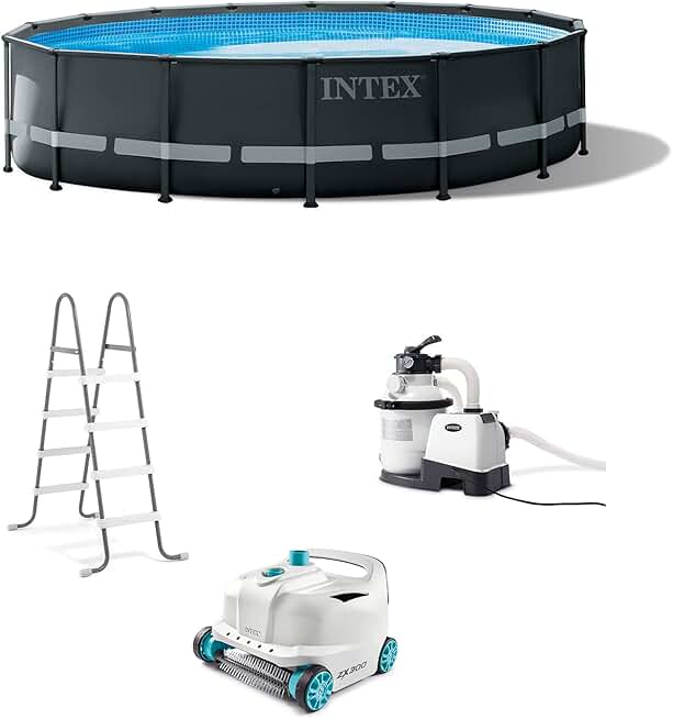 Intex Ultra XTR 16ft x 48in Outdoor Above Ground Swimming Pool Set w/ Pump Bundle w/ 700 Gal Per Hour Pool Cleaner Robot Vacuum & 21 Ft Hose