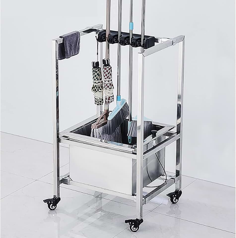 Floor-Mounted Mop Drain Rack, Stainless Steel Floor Mount Mop Sink, Workshop Space Storing Large Long Tools Put Wet Mops Movable Floor Holder Stainless Steel Storage Rack (Battery *1 : 4slots)