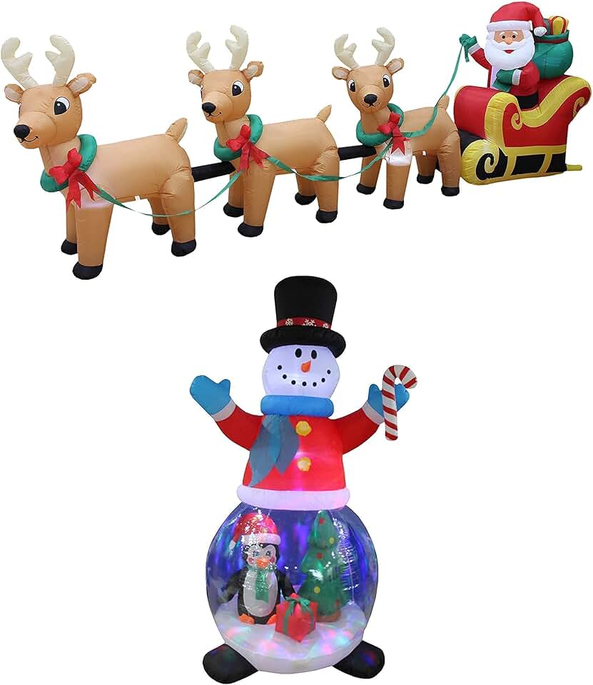 Two Christmas Party Decorations Bundle, Includes 12 Foot Long Christmas Inflatable Santa Claus on Sleigh with 3 Reindeer, and 8 Foot Tall Christmas Inflatable Snowman Globe with Penguins and Gift Box