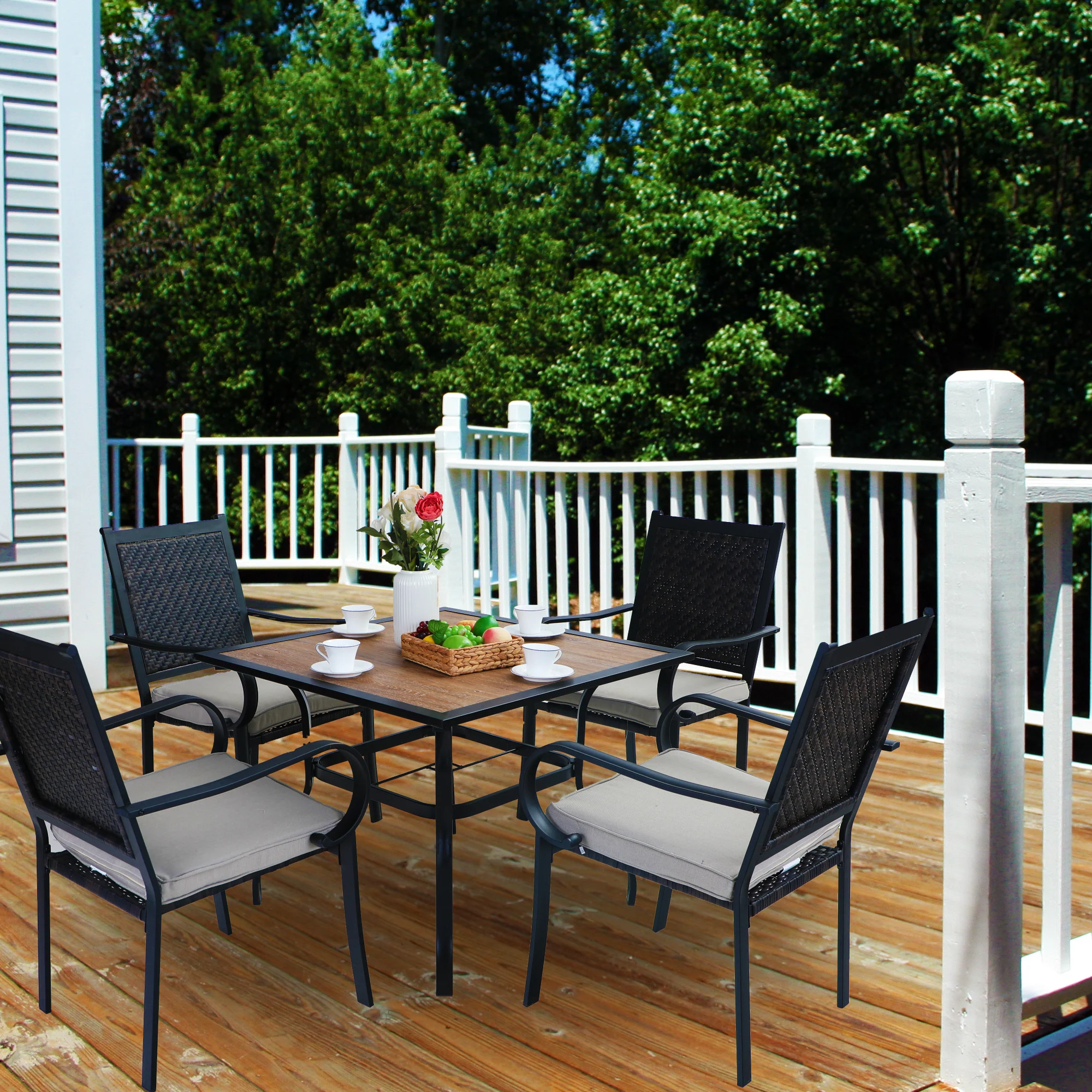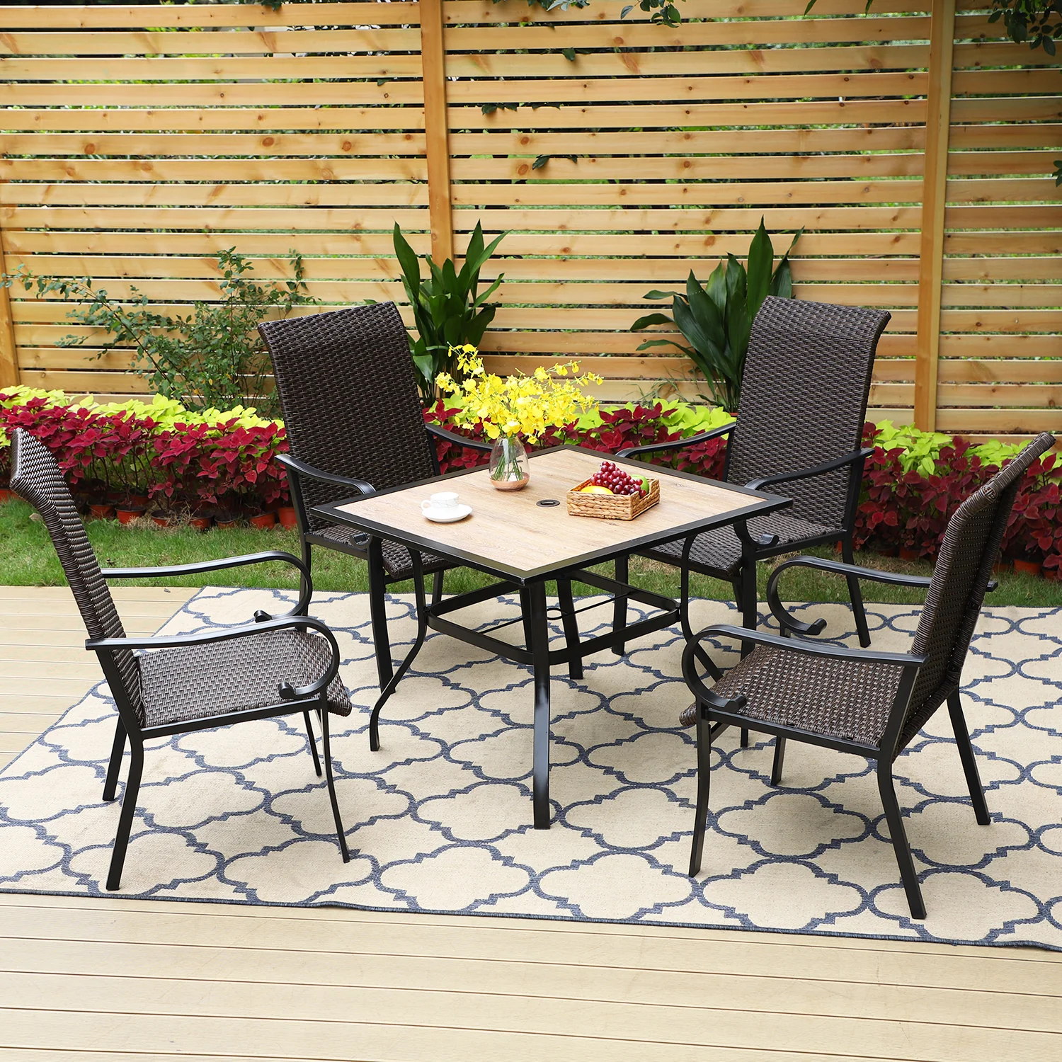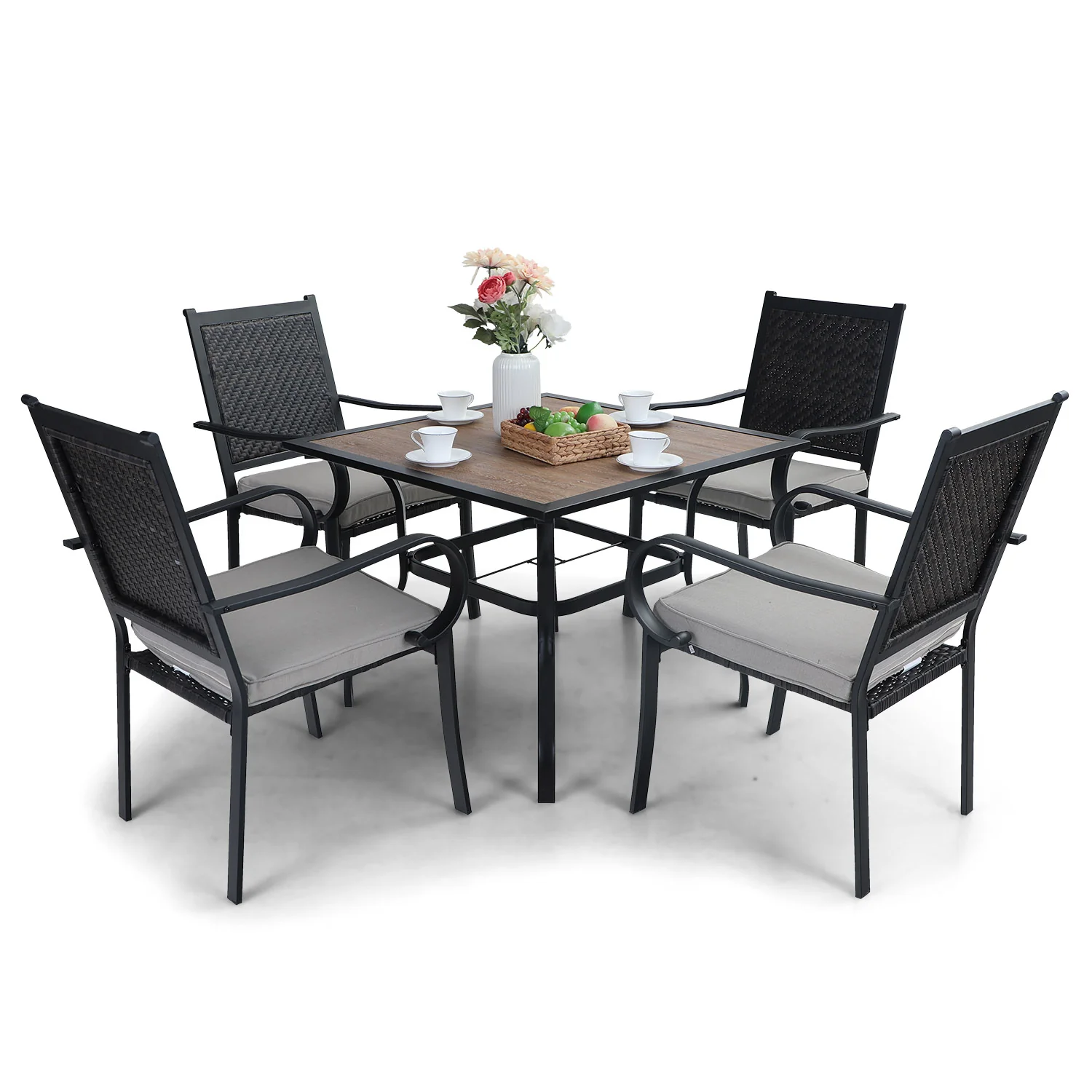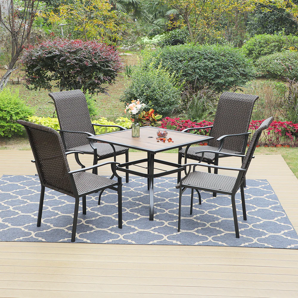 PHI VILLA 5-Piece Rattan Dining Chairs & Wood-look Square Table Patio Dining Set
