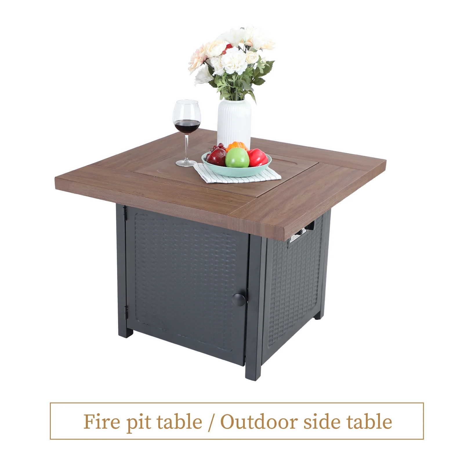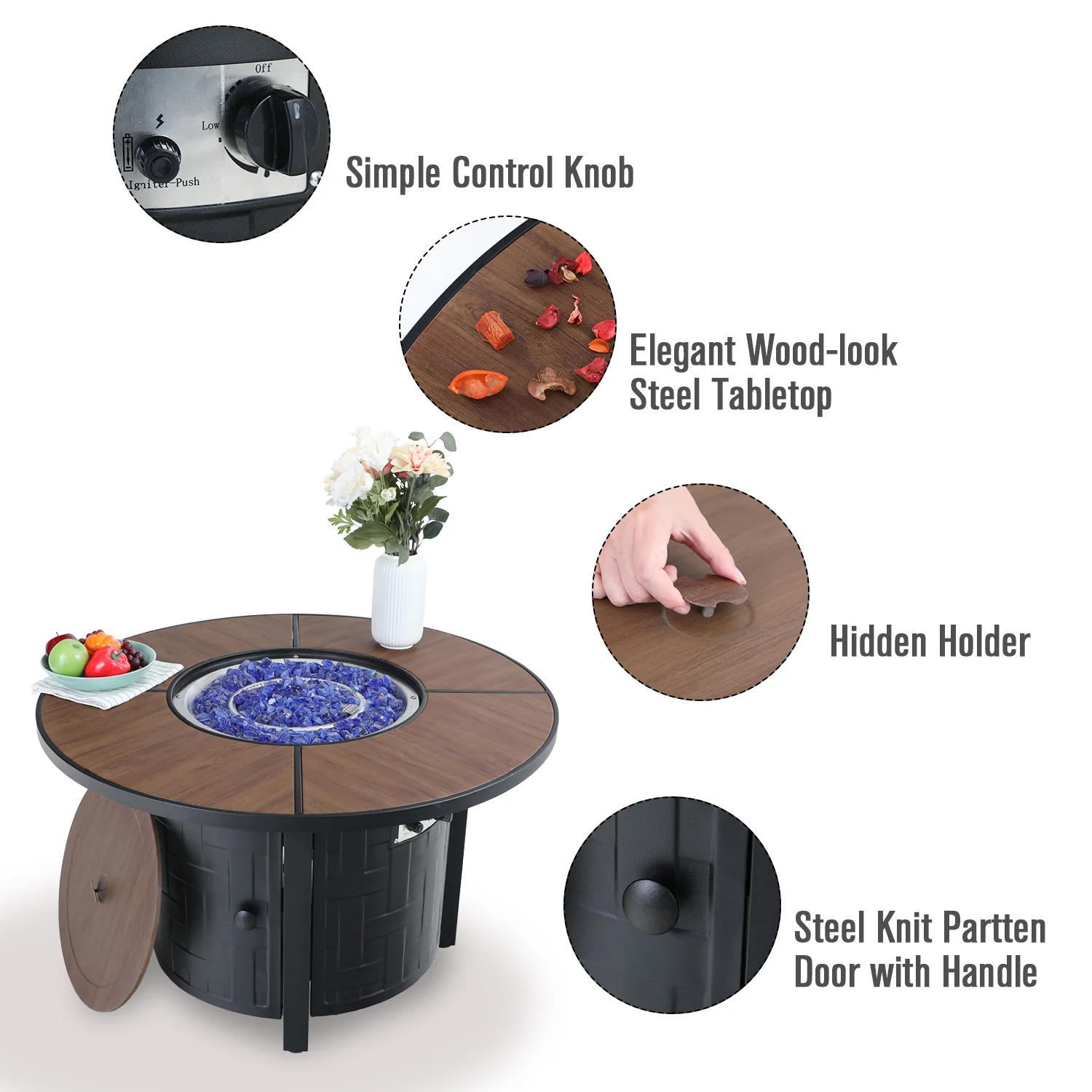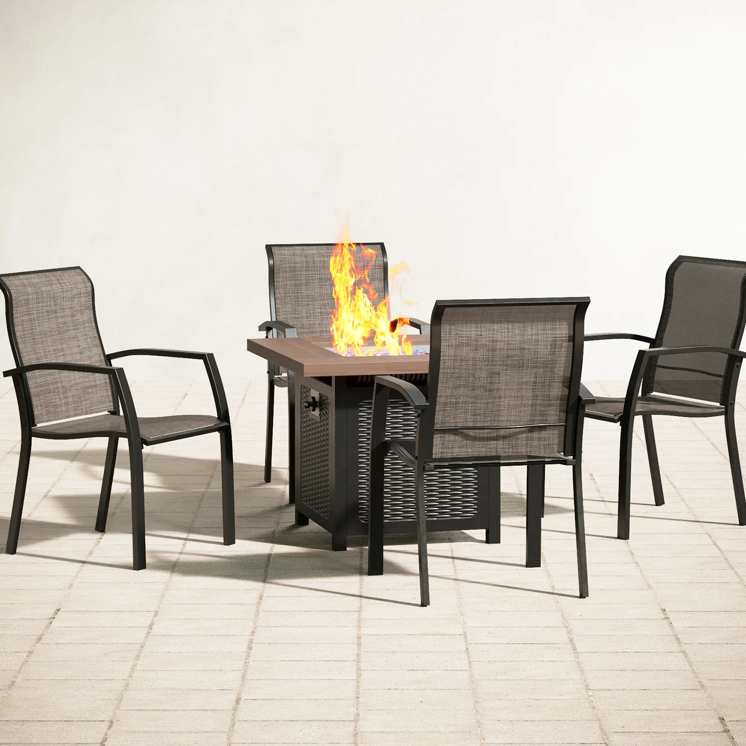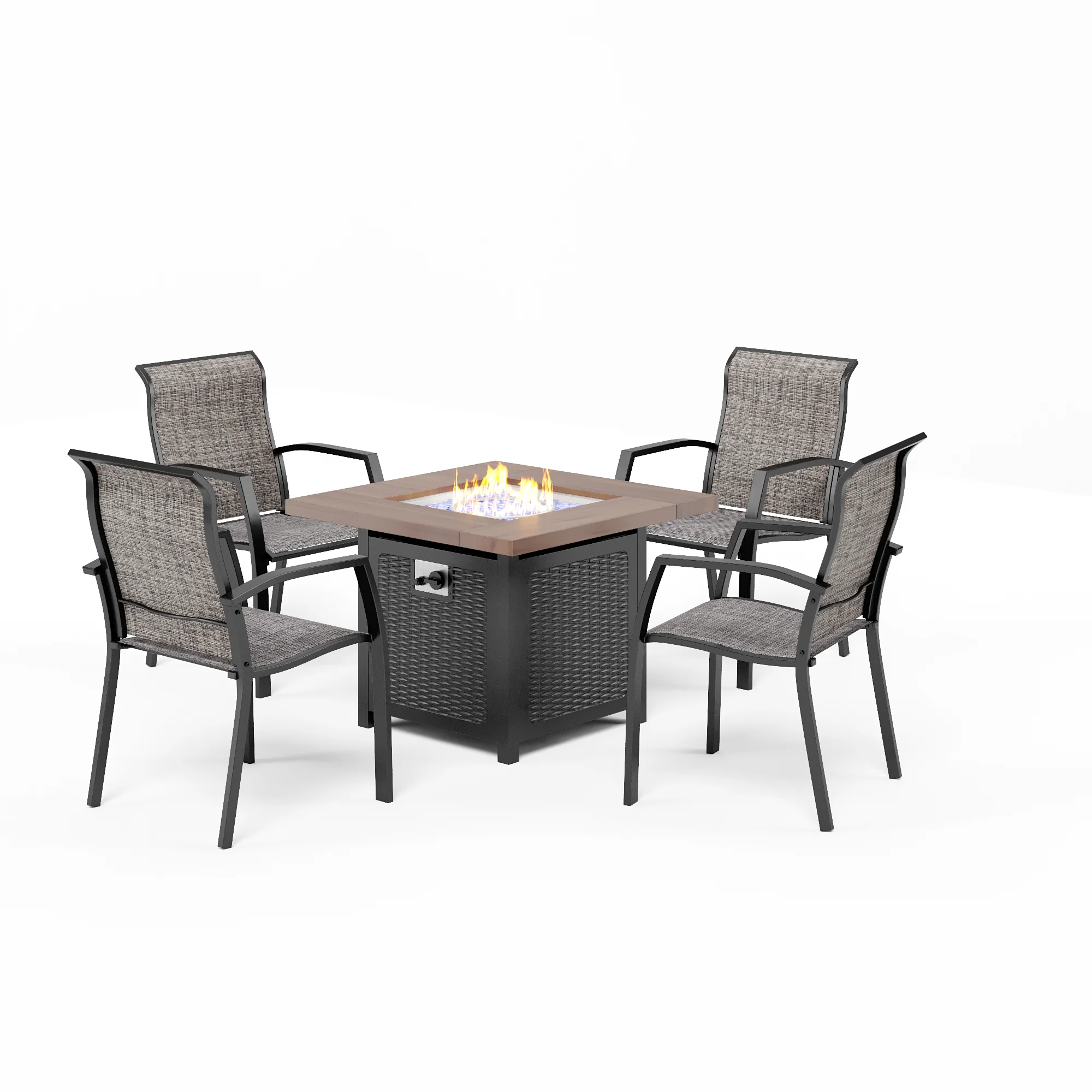 PHI VILLA 5-Piece 34" Wood-look Gas Fire Pit Table & Simple Aluminum Textilene Fixed Chairs Patio Dining Set