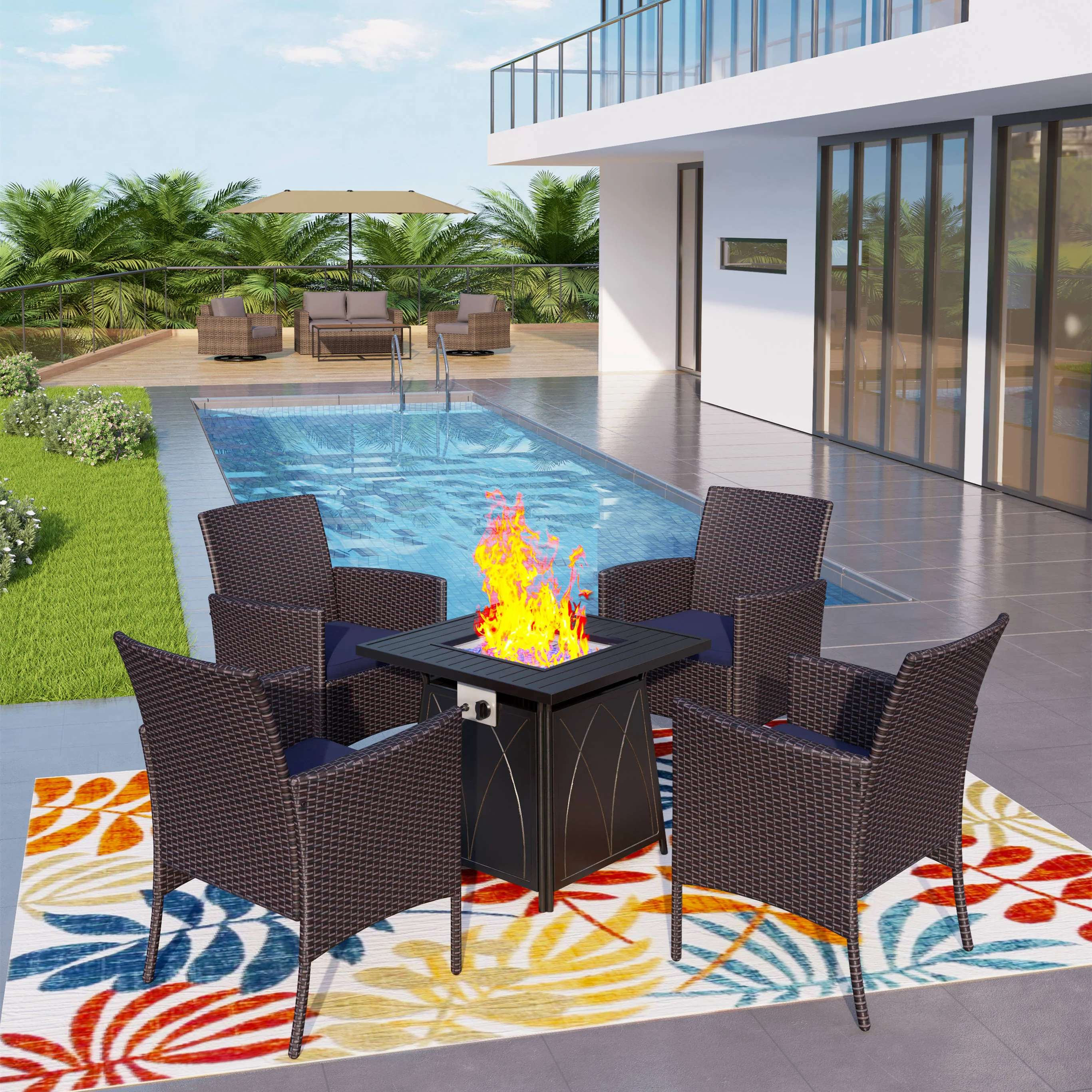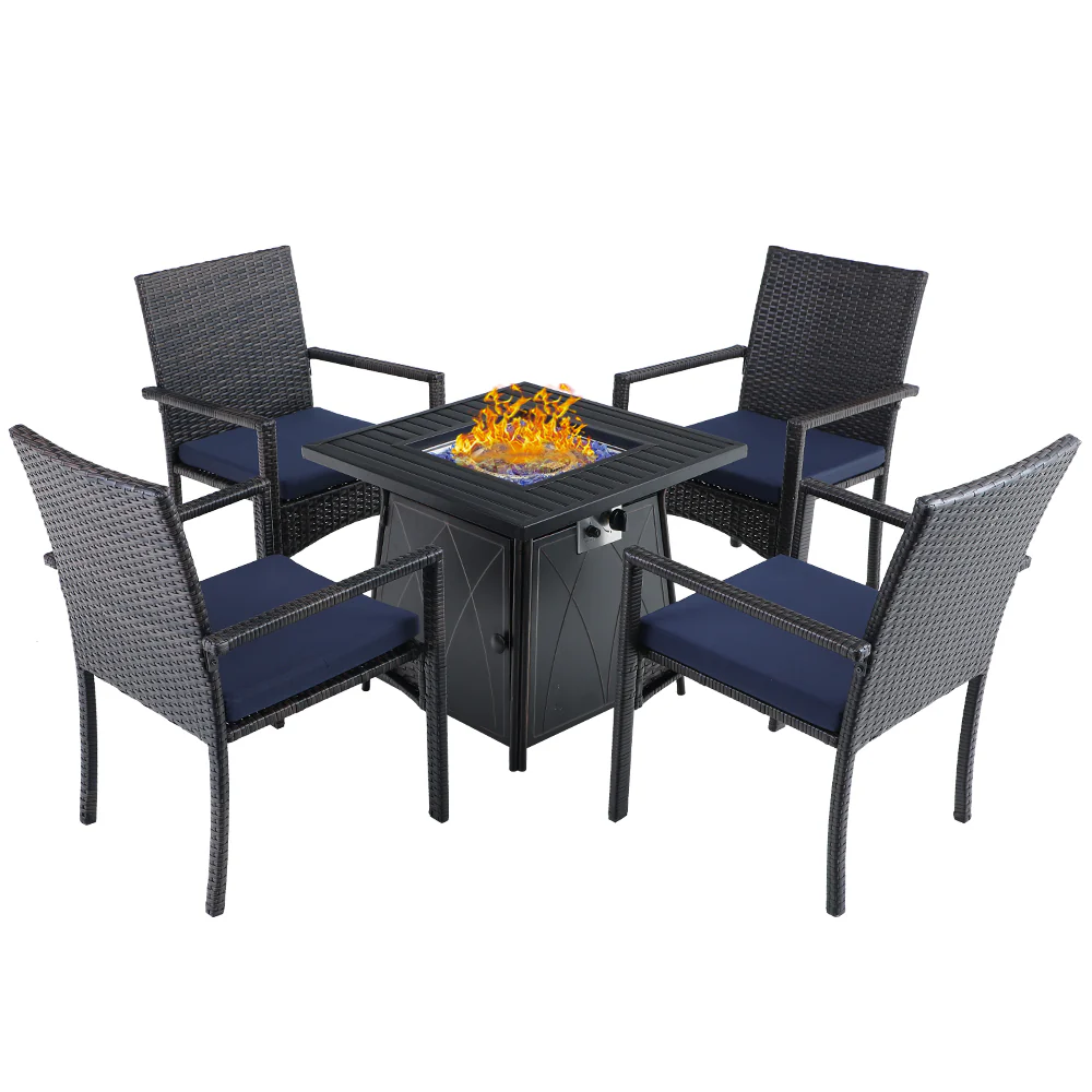 PHI VILLA 5-Piece Dining Set 50,000 BTU Gas Fire Pit Table & Rattan Chairs