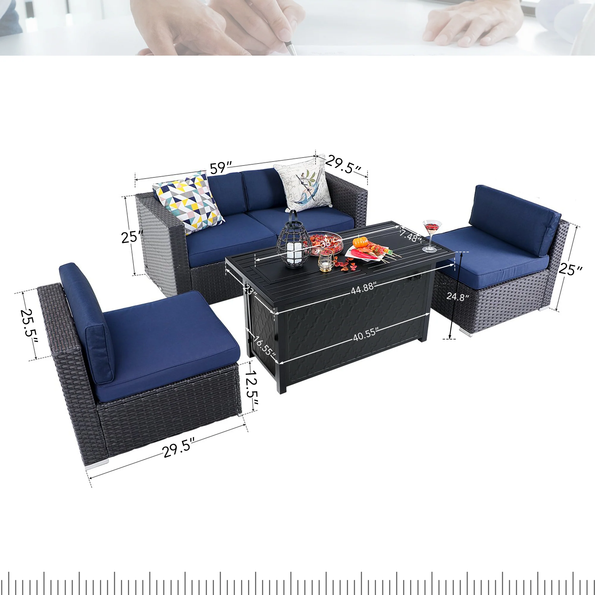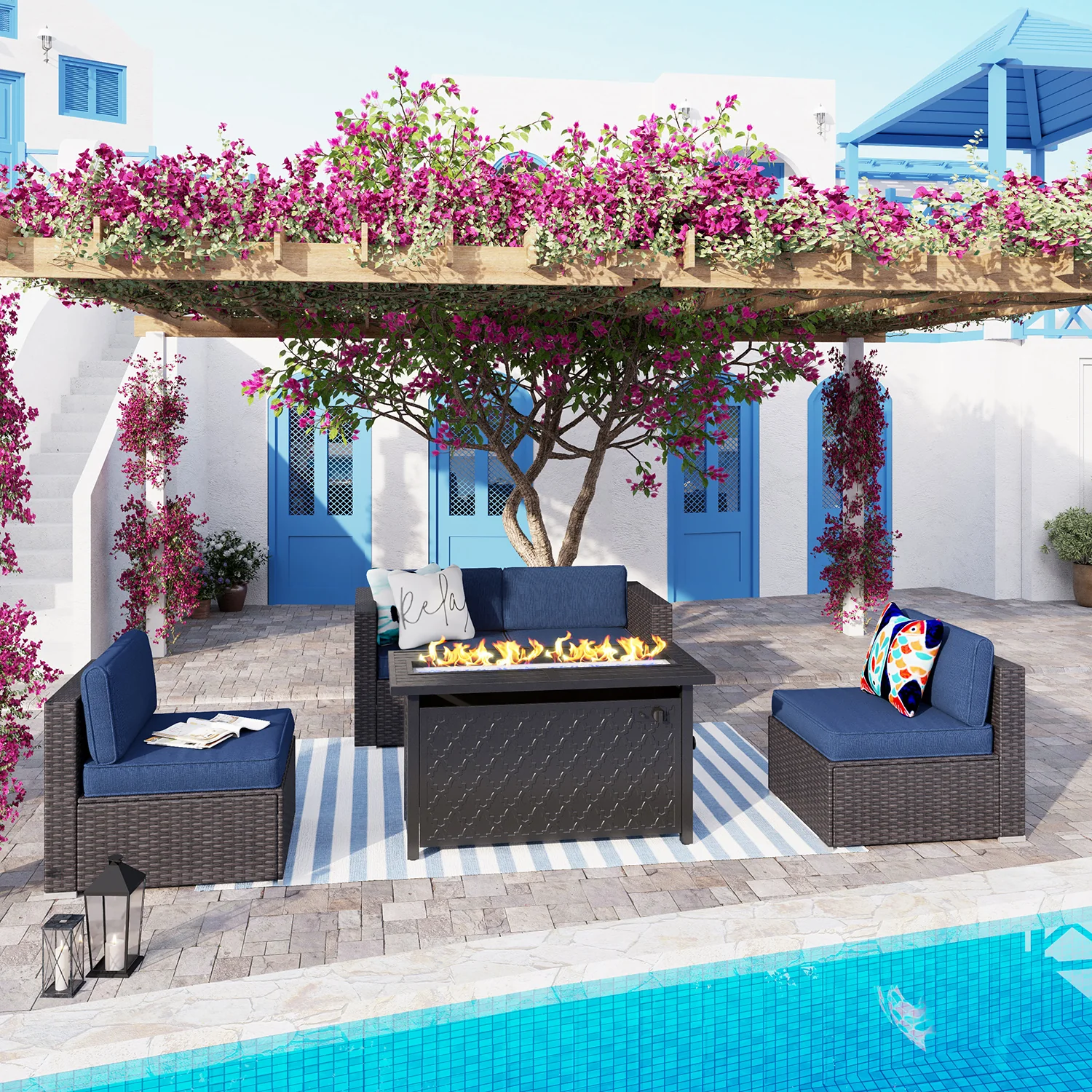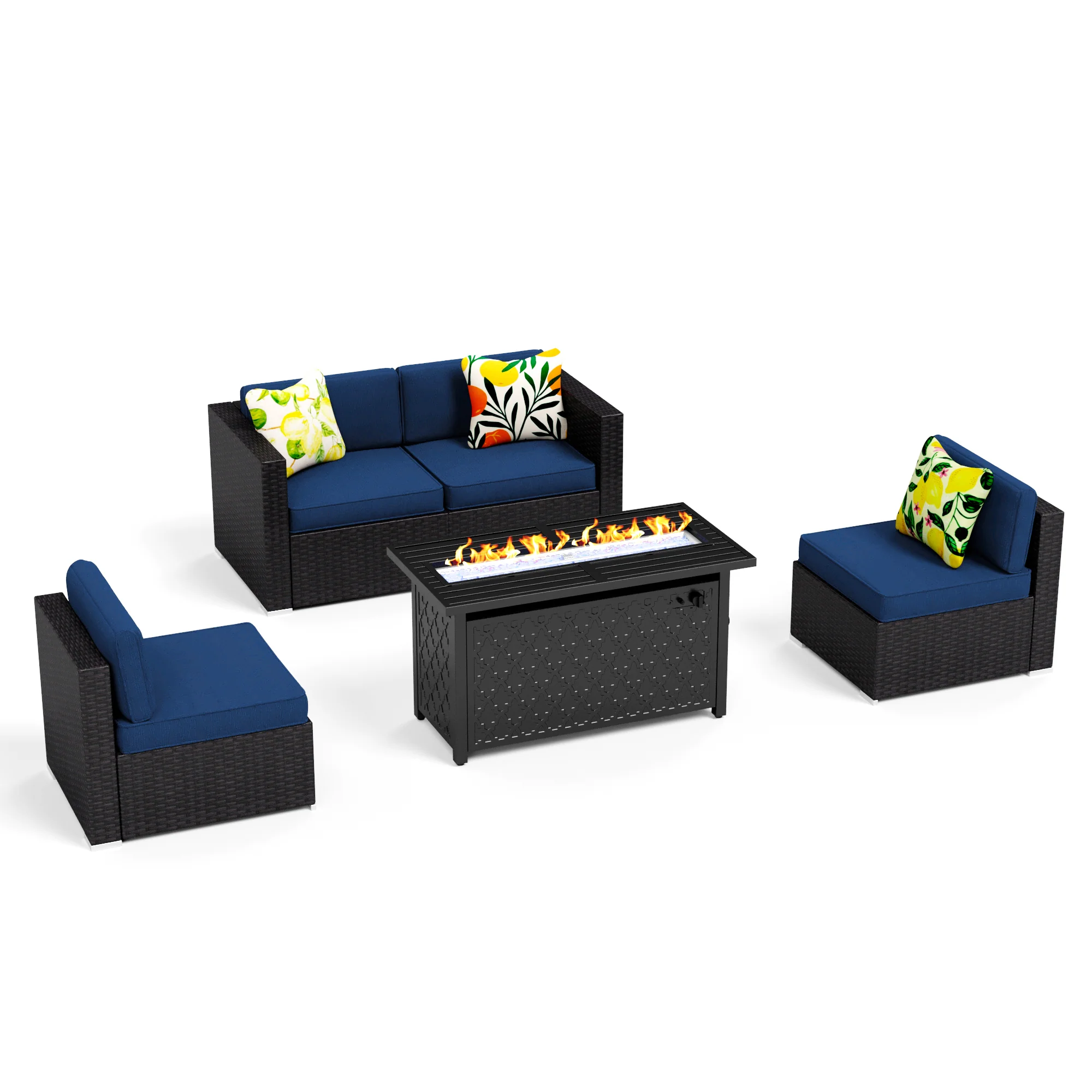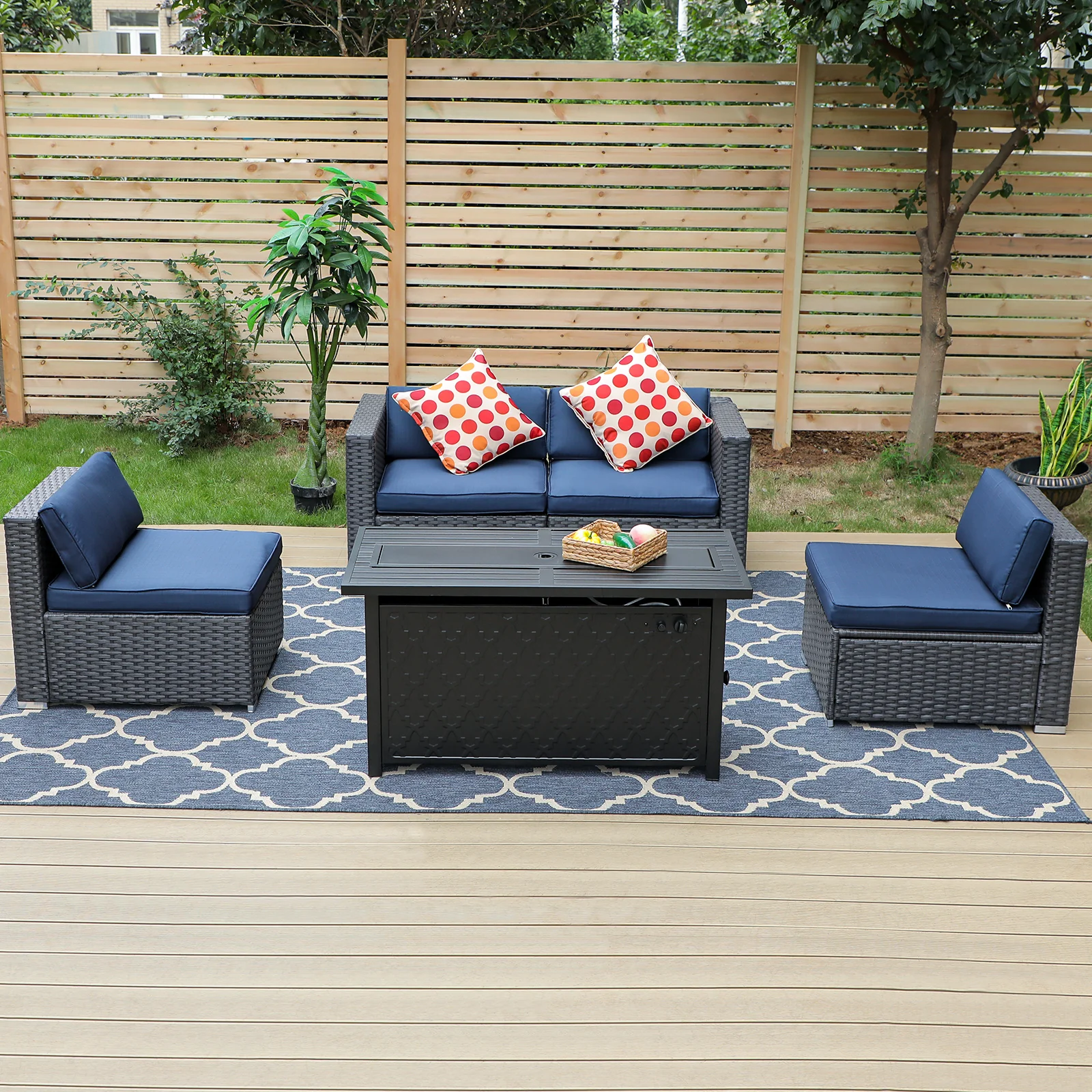 PHI VILLA 5-Piece Gas Fire Pit Table 45"×23“ 50,000 BTU & Rattan Wicker Sectional Sofa Set