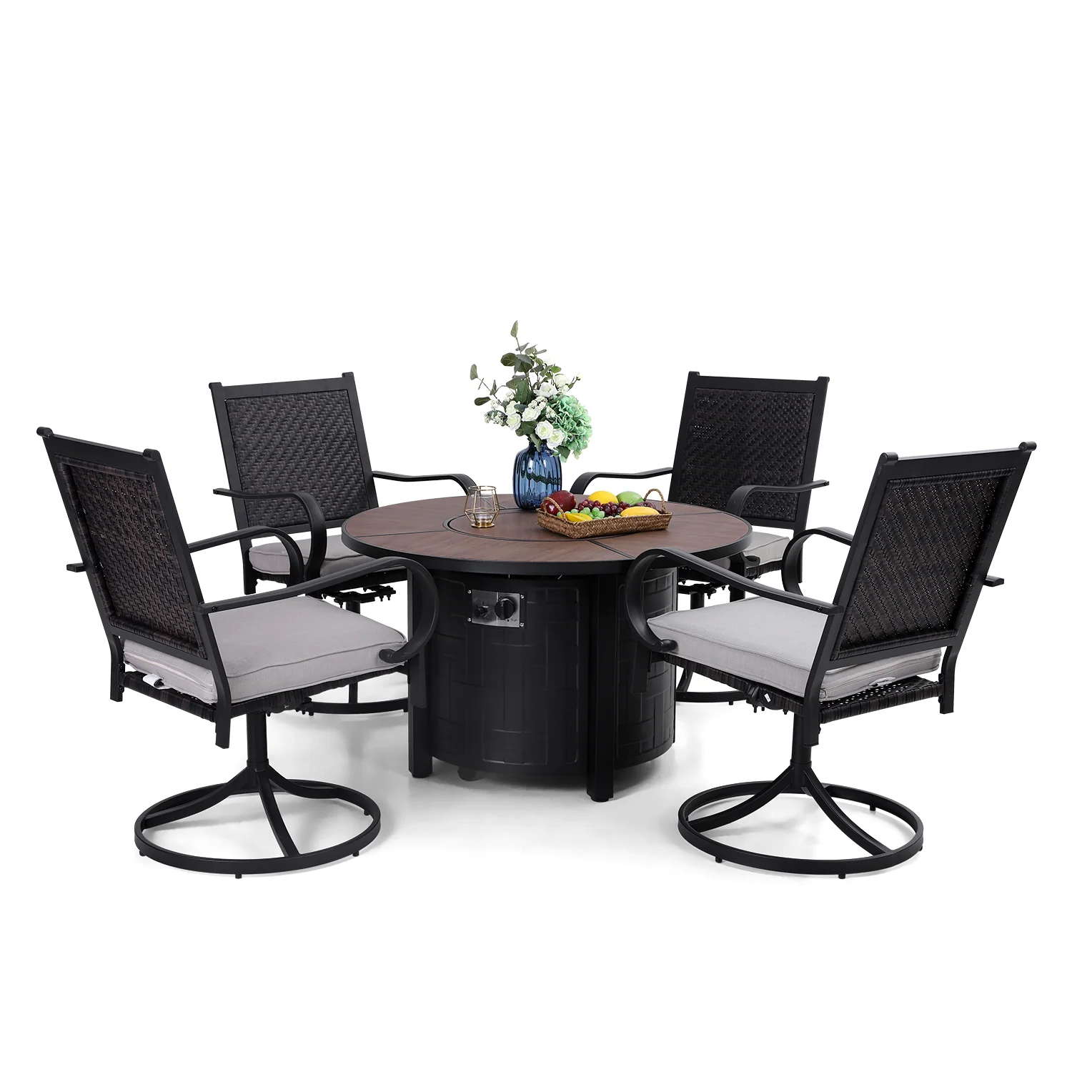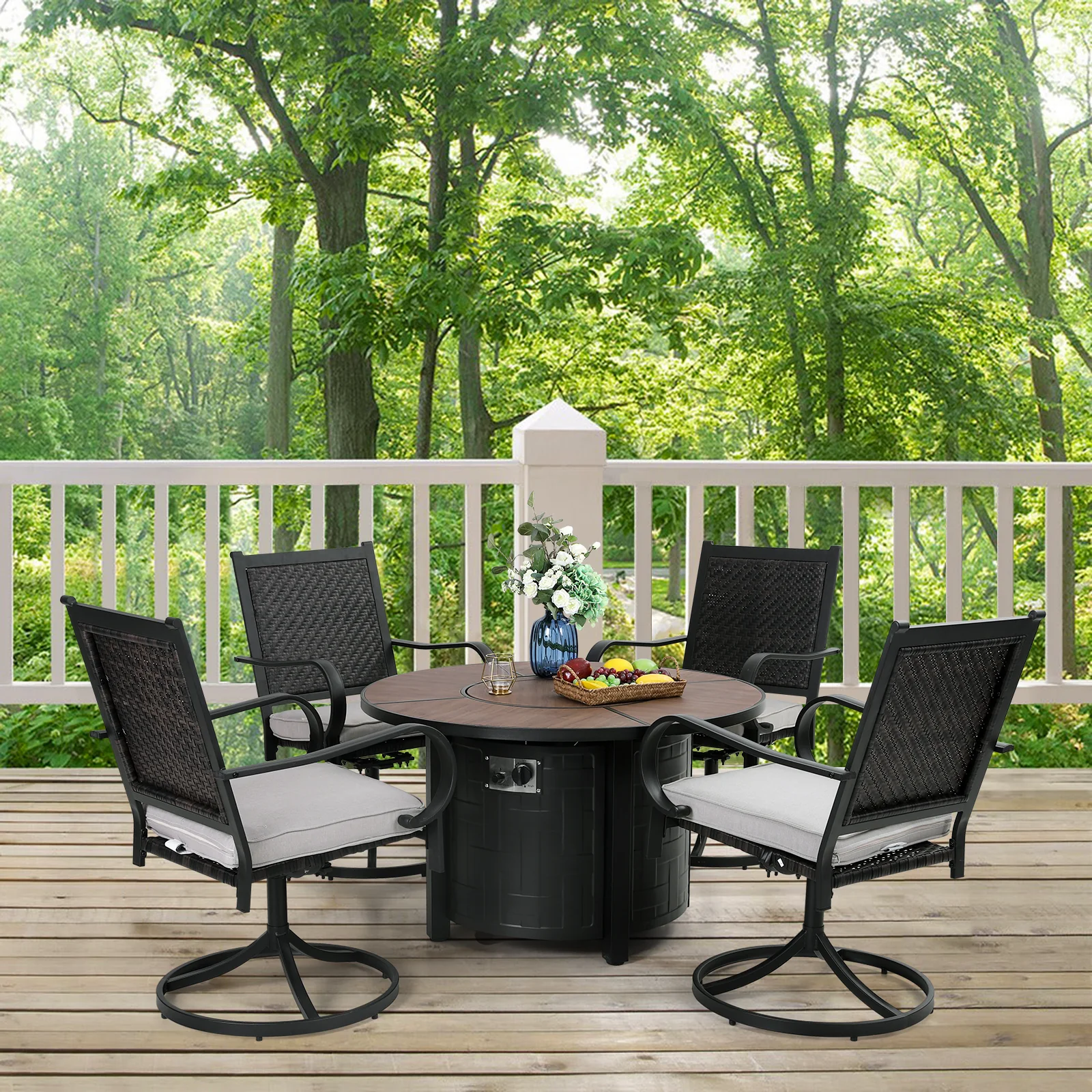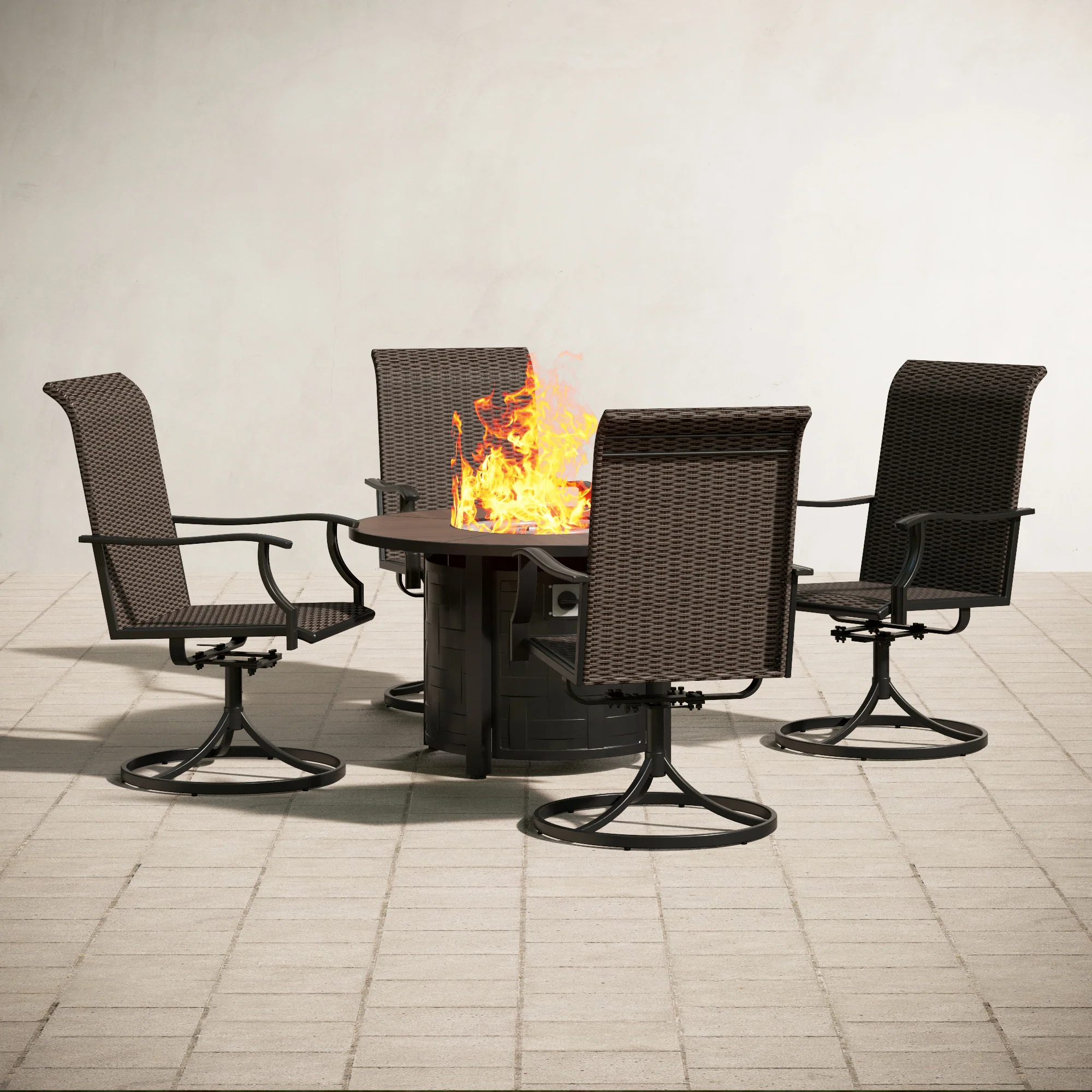 PHI VILLA 5-Piece Fire Pit Table Patio Dining Set with Rattan High Back Swivel Chairs
