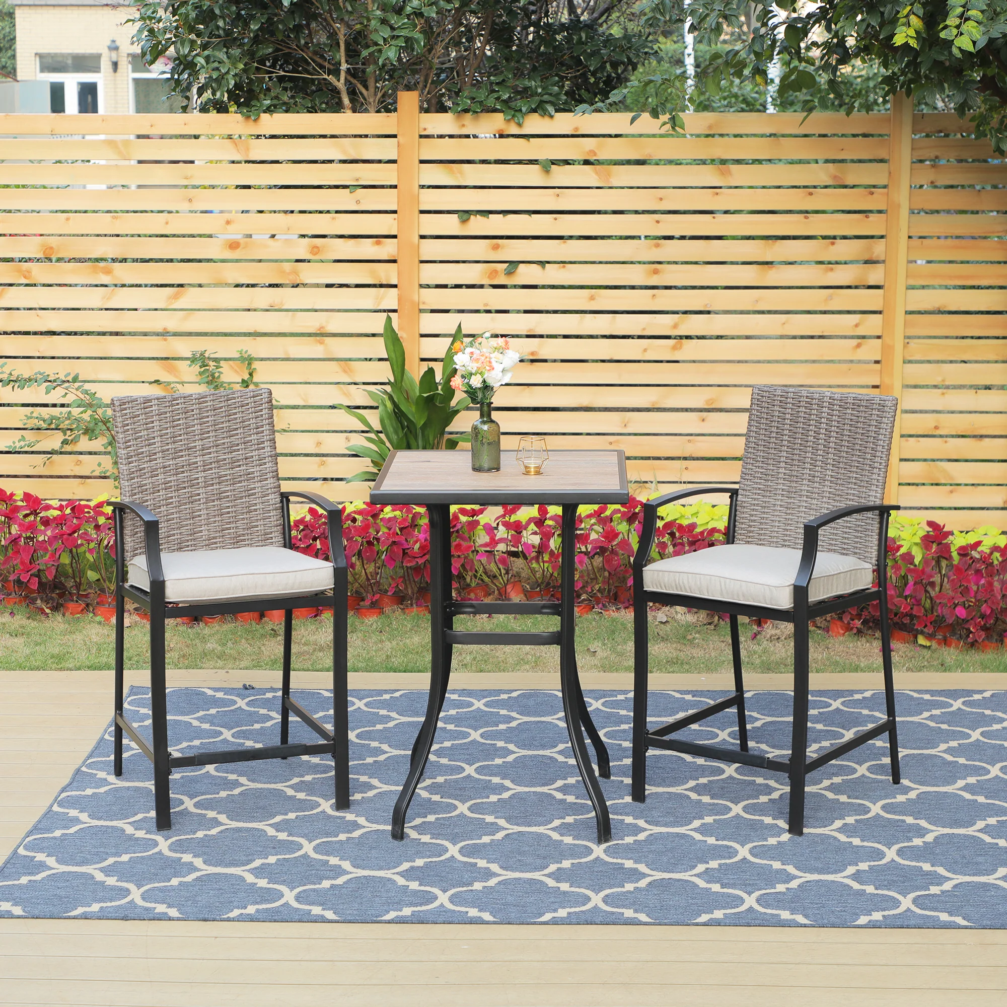 PHI VILLA 3-Piece Patio Set Rattan Chair Back Cushioned High Bar stool & Wood-look High Table