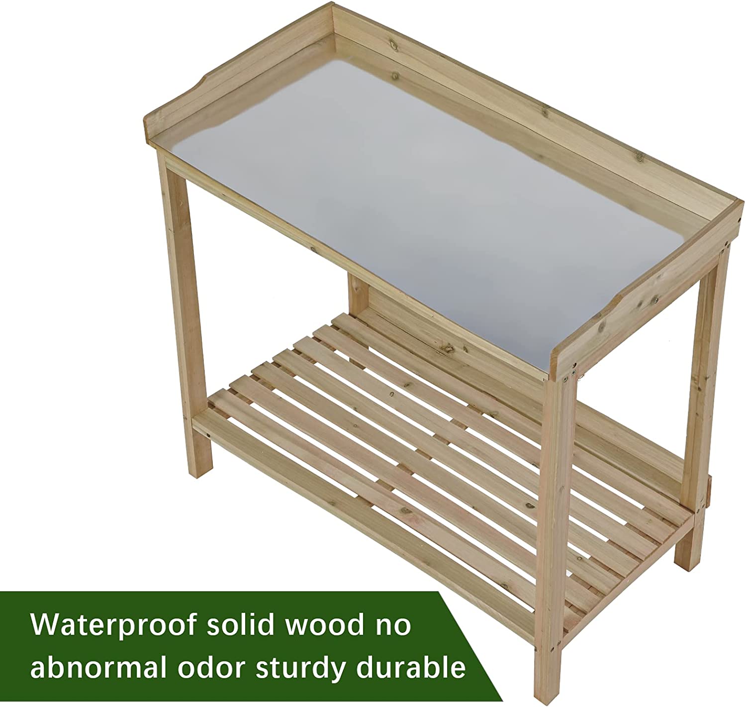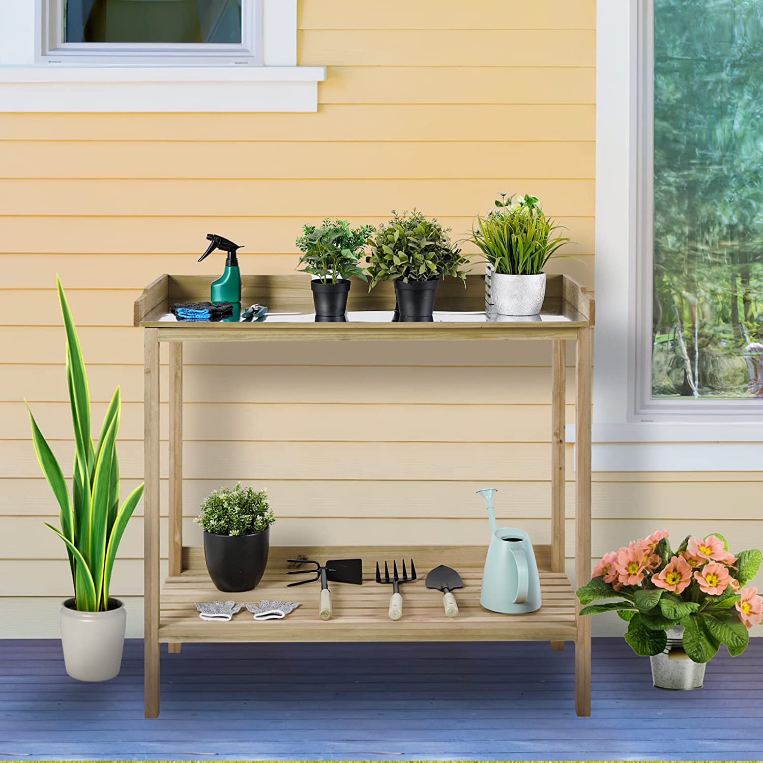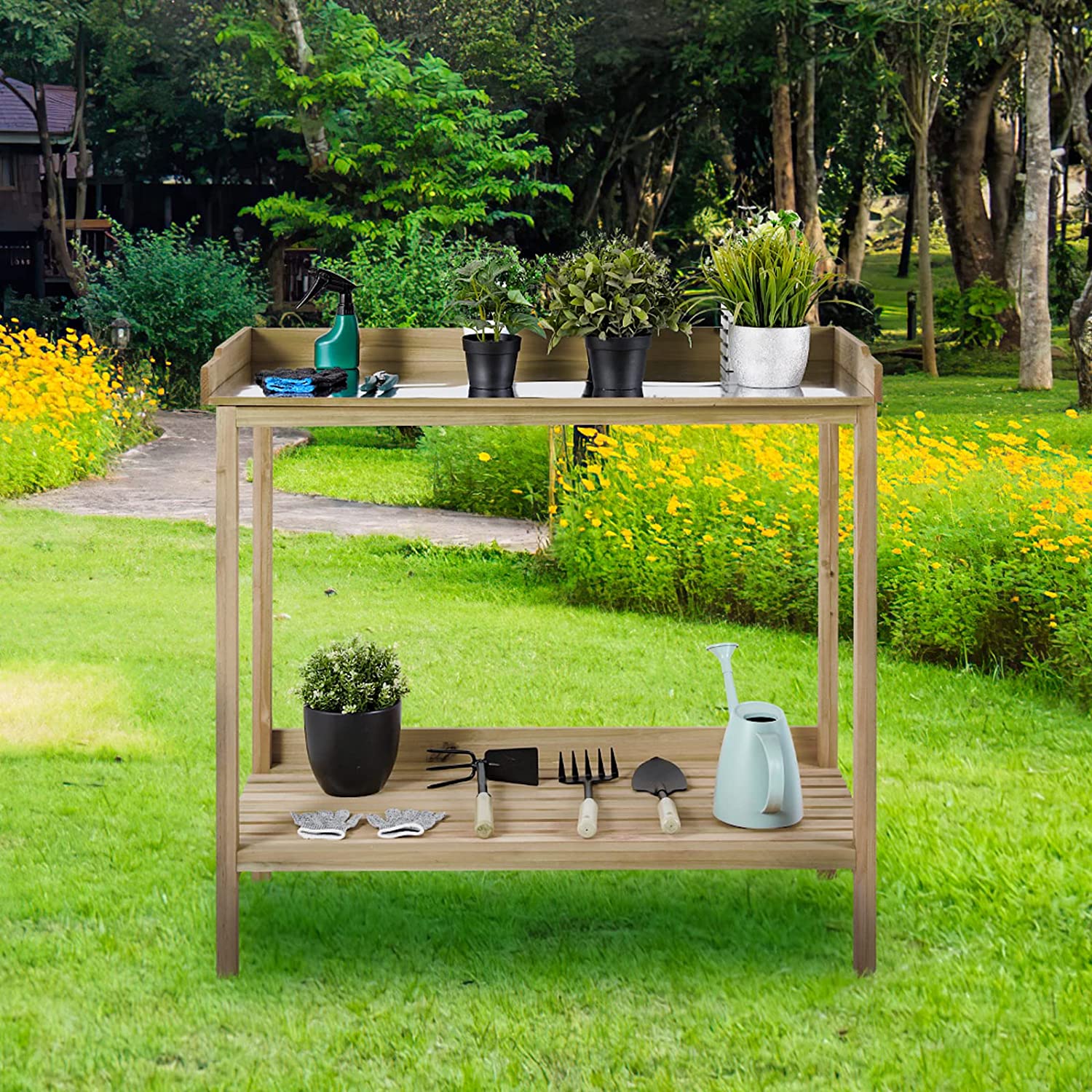 AuAg Outdoor Potting Bench, 2 Tier Planting Table with Metal Tabletop, Garden Potting Table, Wooden Workstation Table, Outside Prep Station for Backyard, Kitchen, Garage, Patio (Natural)