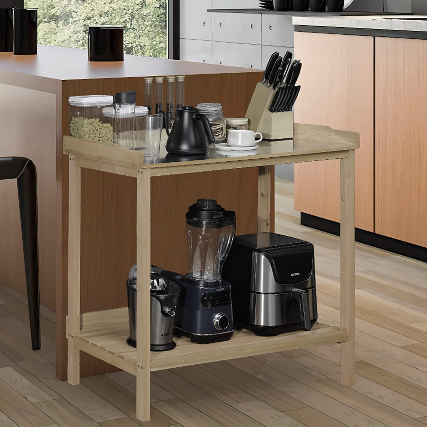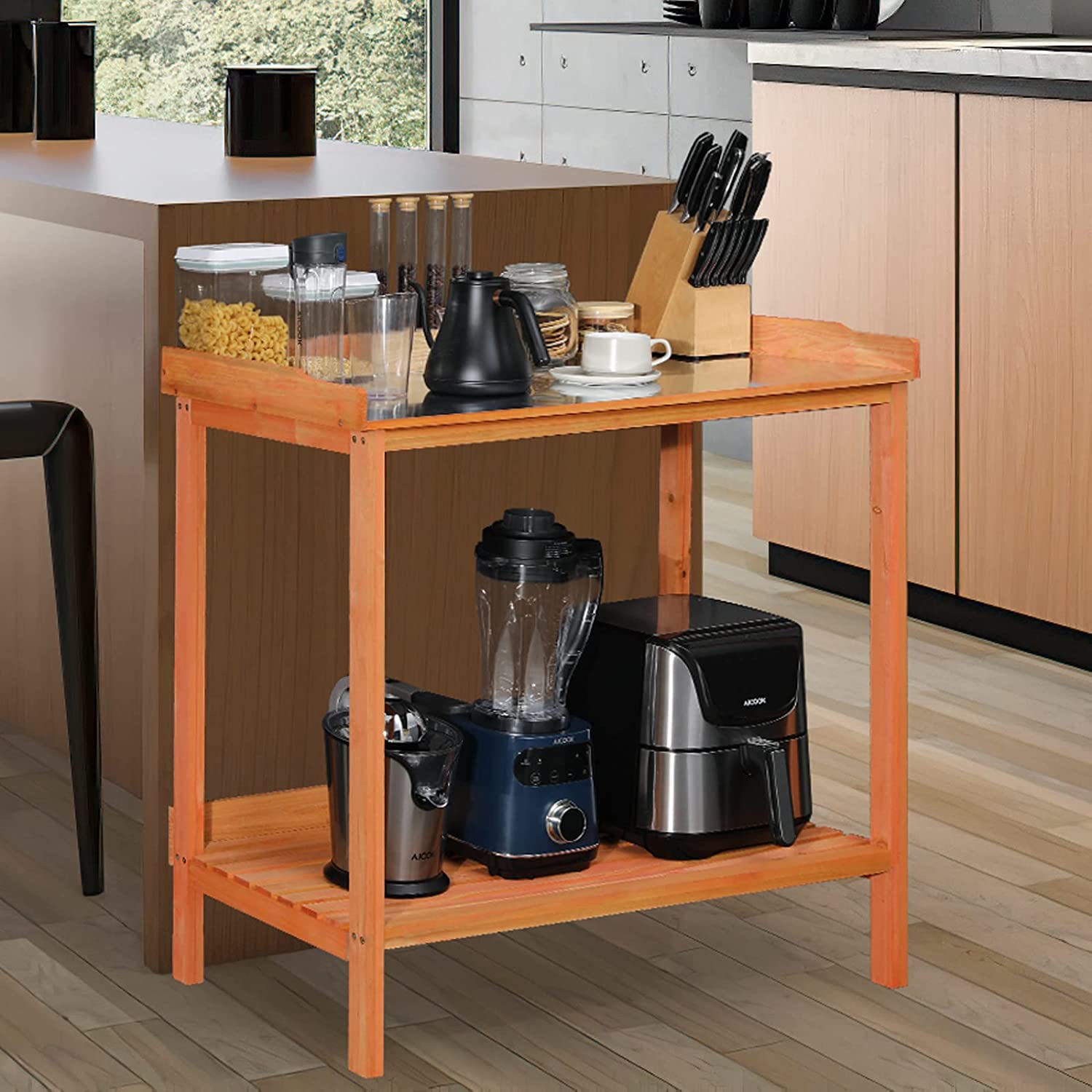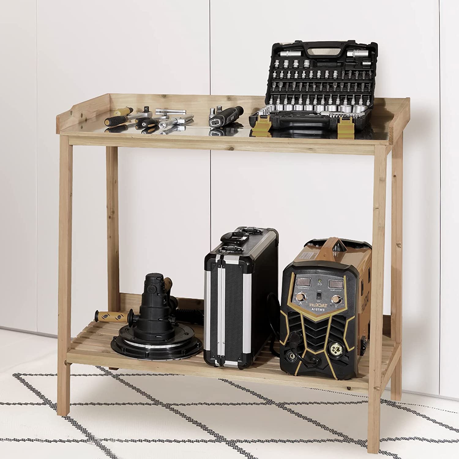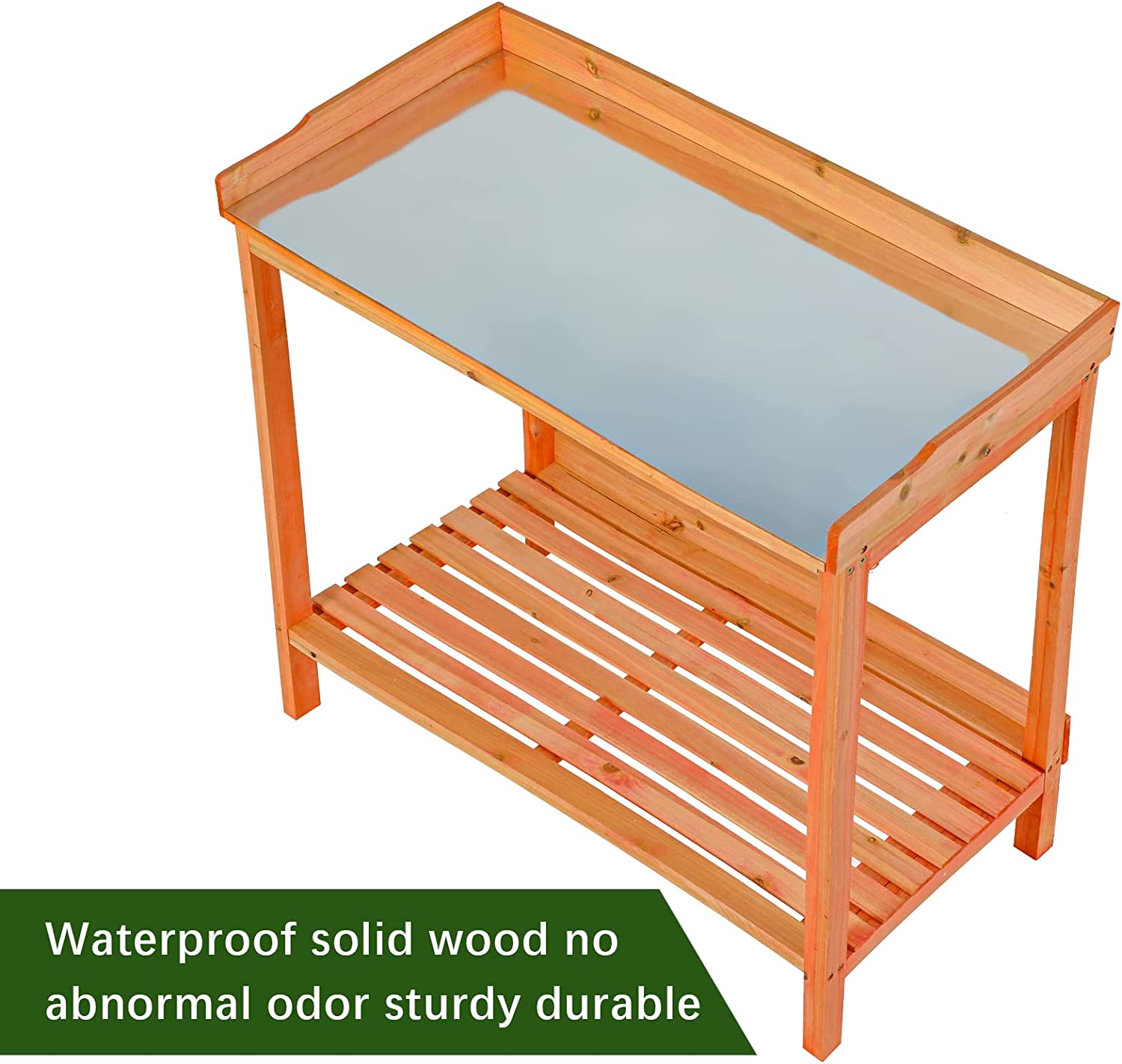 AuAg Outdoor Potting Bench, 2 Tier Planting Table with Metal Tabletop, Garden Potting Table, Wooden Workstation Table, Outside Prep Station for Backyard, Kitchen, Garage, Patio (Natural)