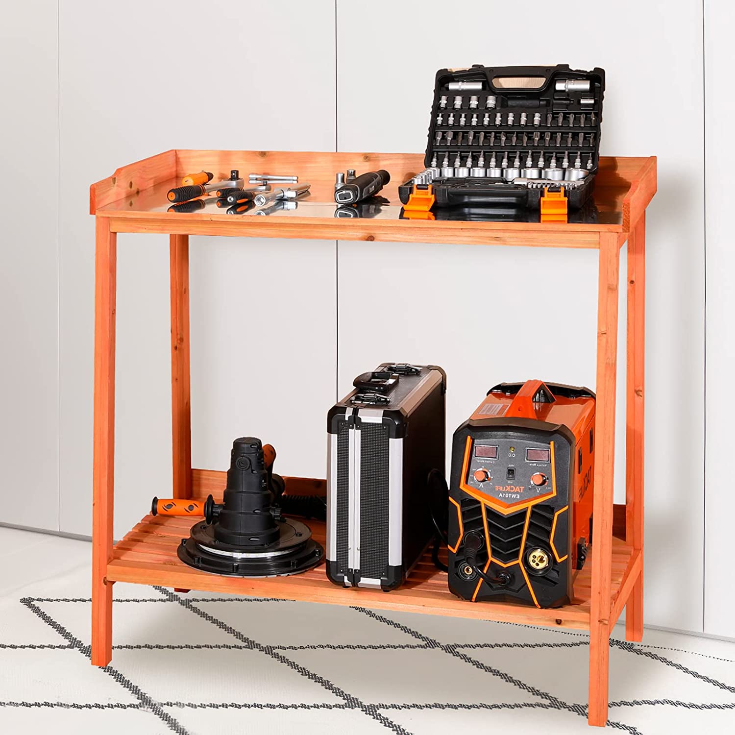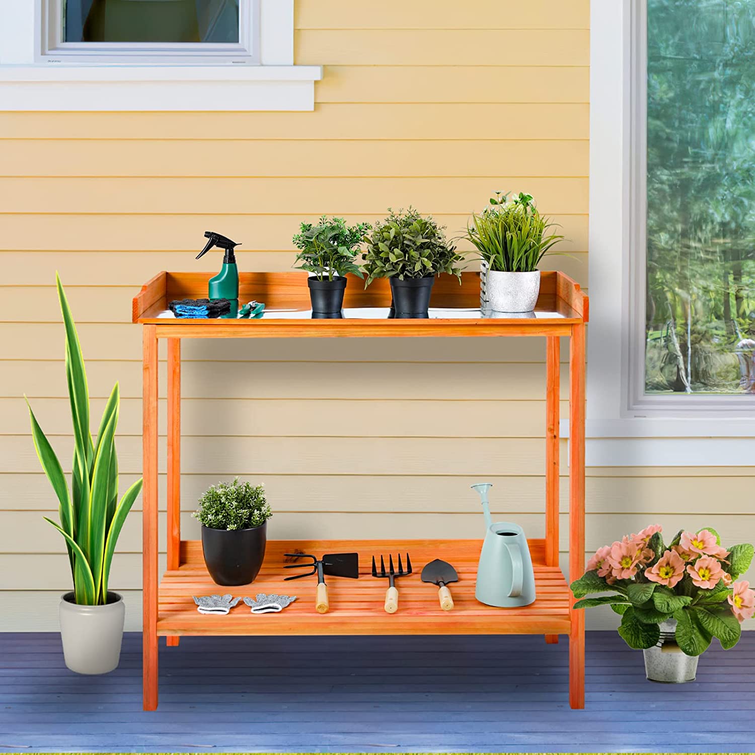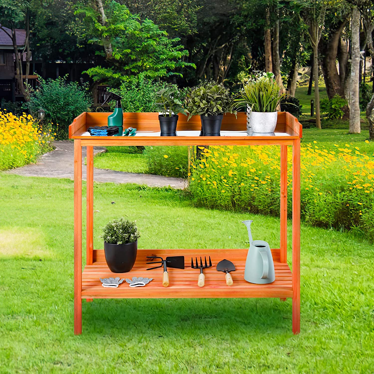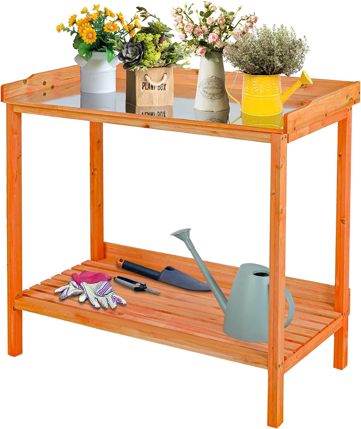 AuAg Outdoor Potting Bench, 2 Tier Planting Table with Metal Tabletop, Garden Potting Table, Wooden Workstation Table, Outside Prep Station for Backyard, Kitchen, Garage, Patio (Golden Red)