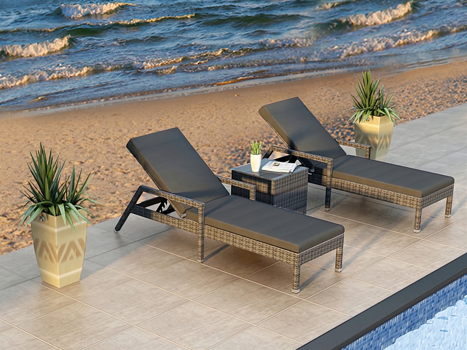 District HDPE Wicker Textured Slate 3 Piece Reclining Chaise Lounge Set