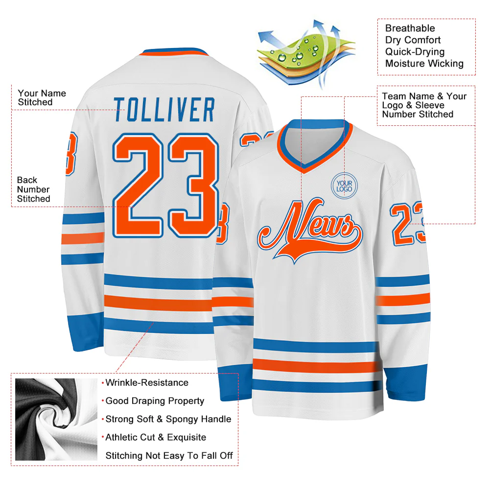 Custom White Orange-Blue Hockey Jersey