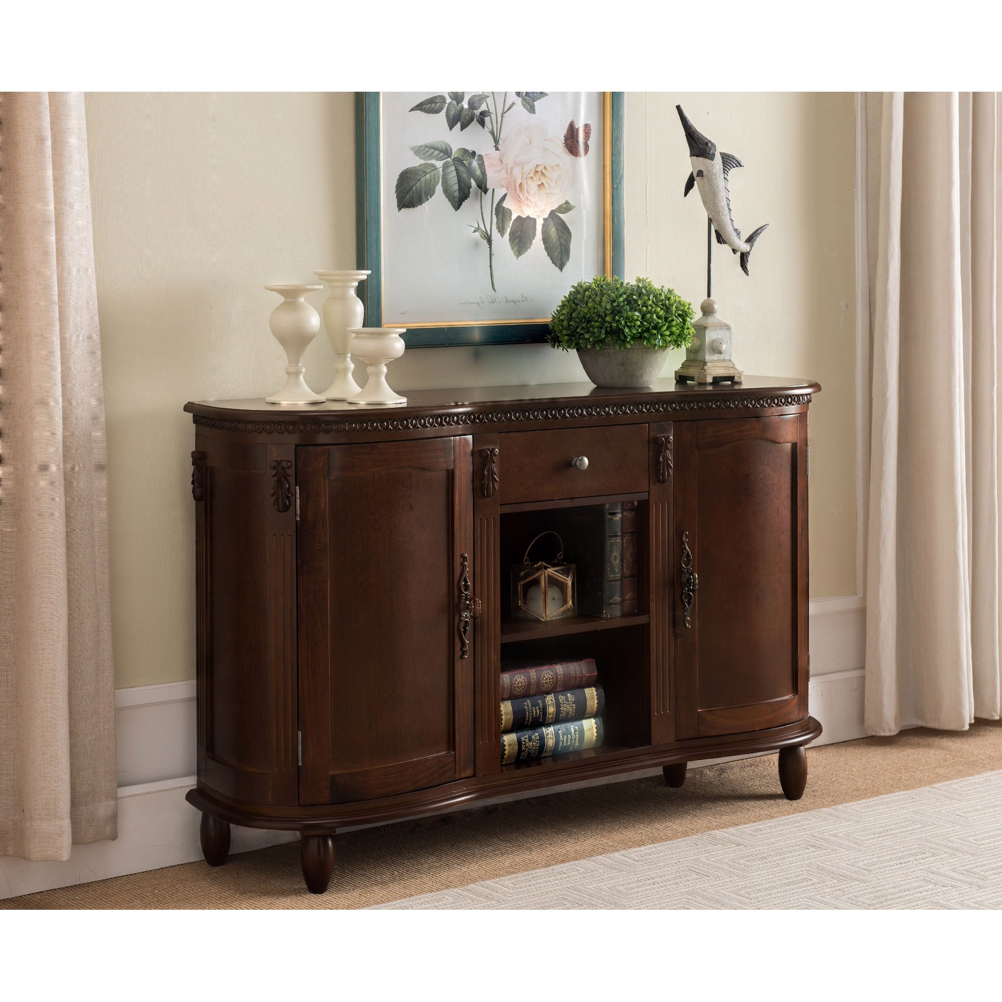 Pilaster Designs Adrian Walnut Wood Contemporary Console Buffet Display Storage Table with 2 Cabinets, Drawer & Shelves