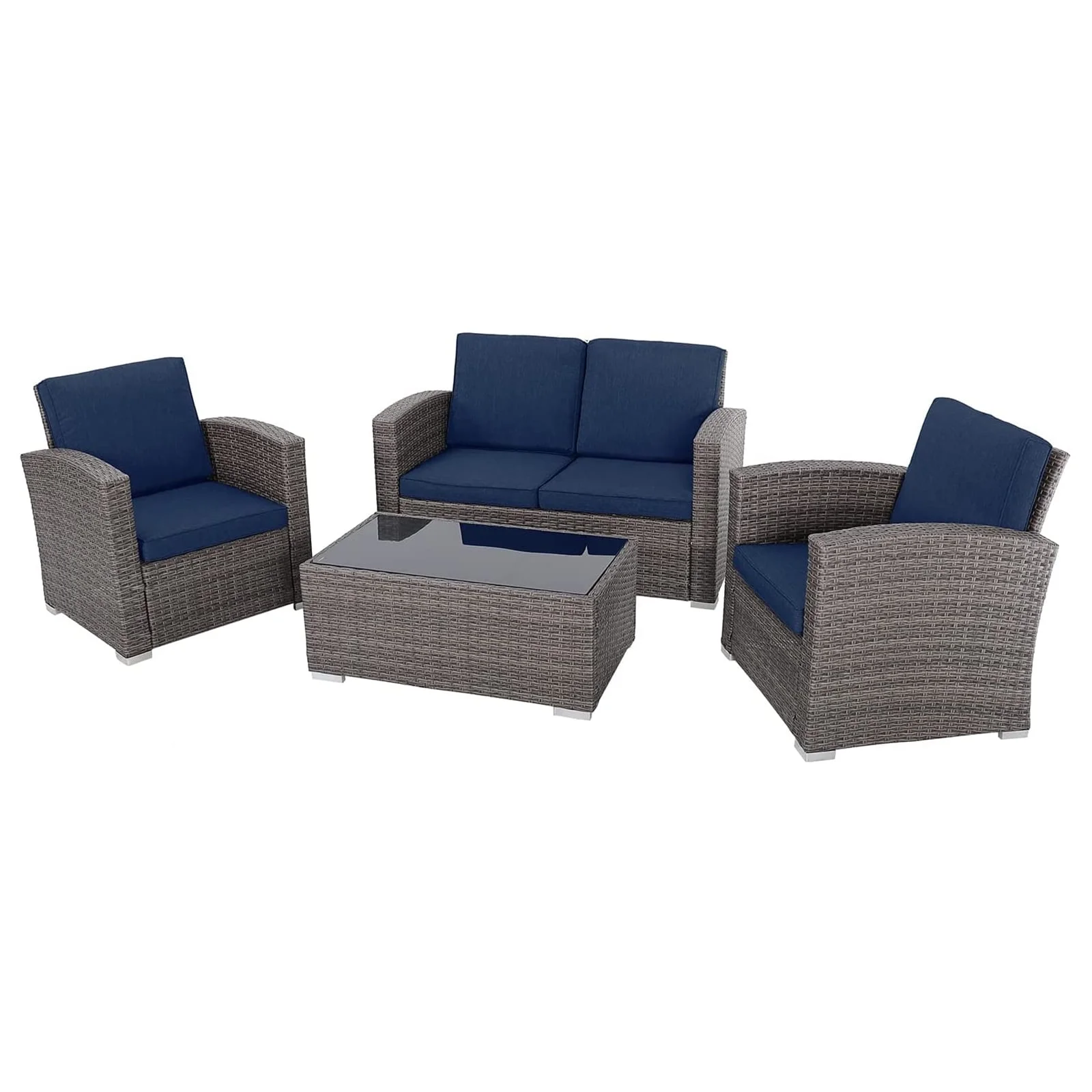 JOIVI 4 Pieces PE Rattan Sectional Outdoor Conversation Sofa Set with Gray Wicker, Navy Blue Cushion