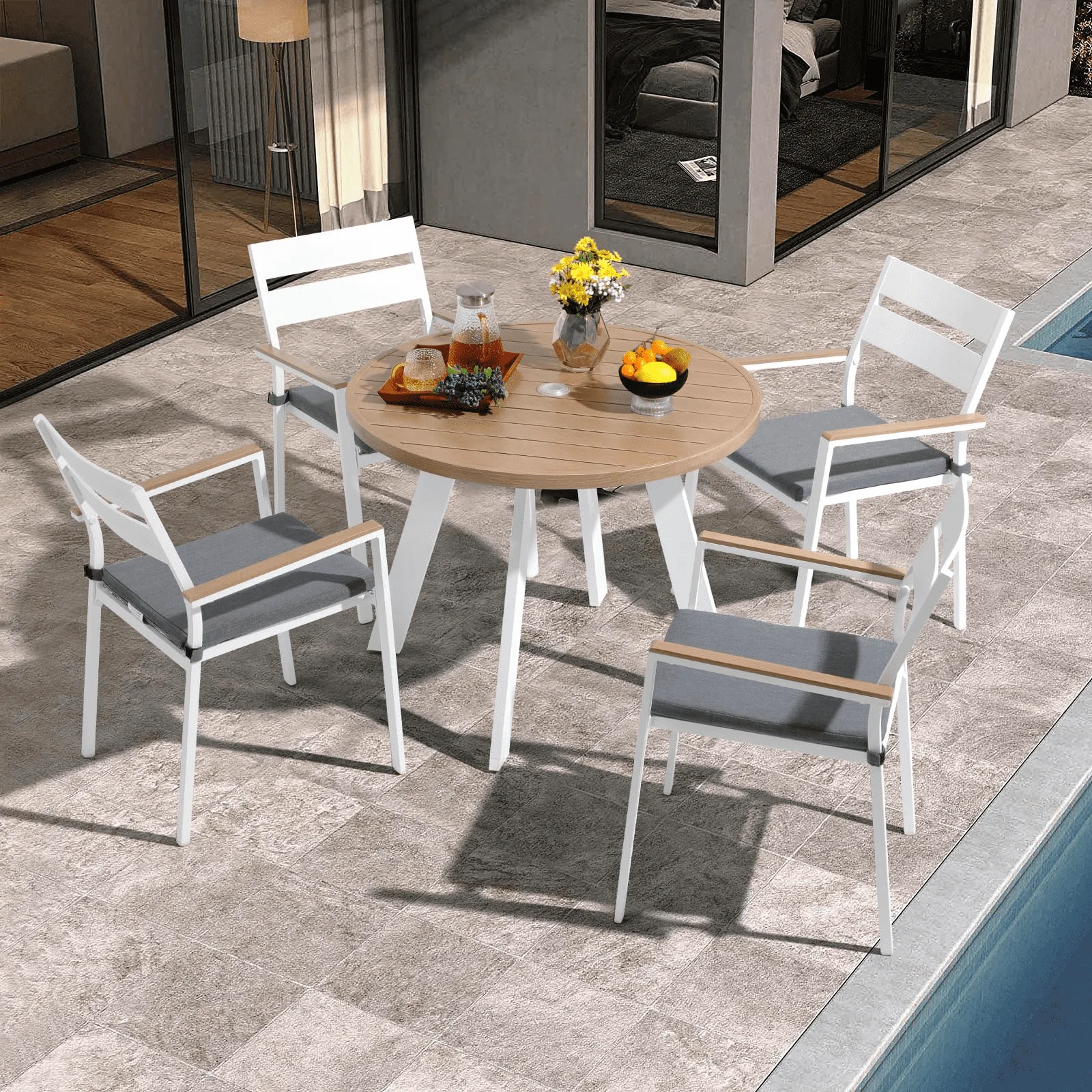 JOIVI 5 Piece Outdoor Dining Set, Aluminum Patio Dining Table and Stackable Chairs Set for 4 People, Wood Grain Tabletop with 2.05” Umbrella Hole, for Deck, Backyard, Garden, Gray Cushions