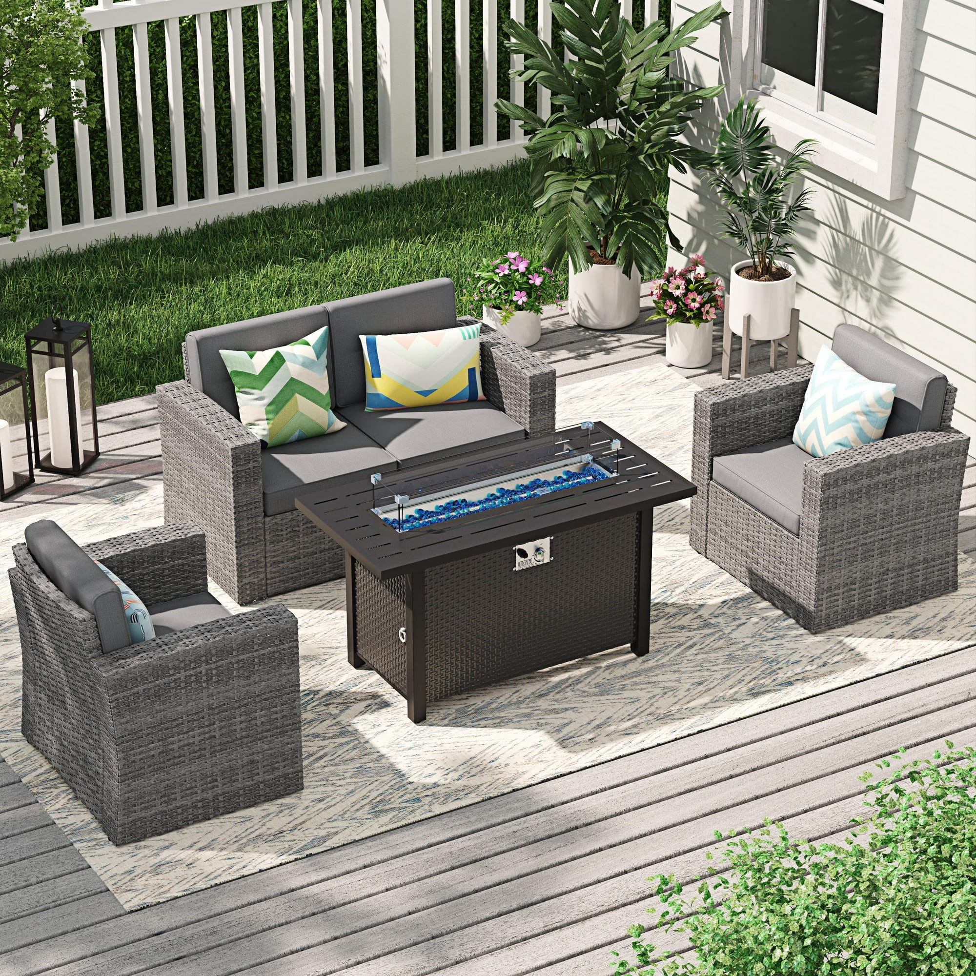 JOIVI 4 Piece Patio Furniture Conversation Set with 45 Inch Fire Pit Table, Wicker Patio Sofa Set with 50,000 BTU Gas Fire Pit for Garden, Deck, Backyard, Parties, Gray