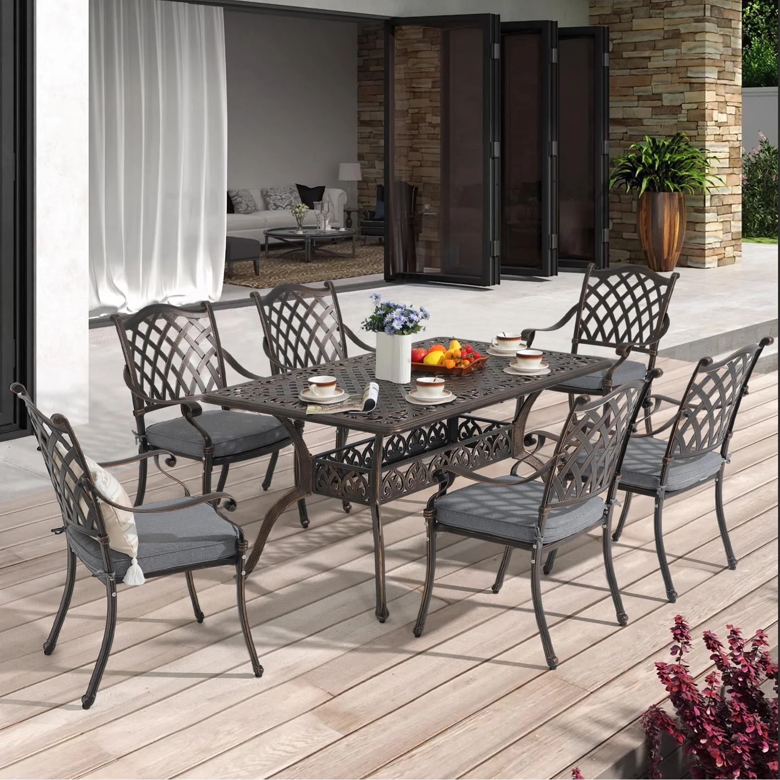 JOIVI 7 Piece Patio Furniture Dining Set, Cast Aluminum Outdoor Dining Chairs and Table Set with Umbrella Hole, Antique Bronze Stackable Chairs Set for Balcony, Lawn, Garden, Backyard