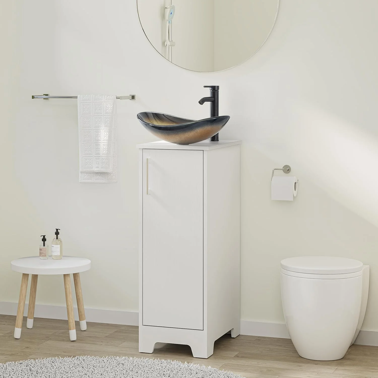 pingduo 13" White Bathroom Vanity with Sink Combo,Small Bathroom Vanity Cabinet Champagne Boat Tempered Glass Vessel Sink & Chrome Water Save Faucet & Solid Brass Pop Up Drain(029CH+B08)