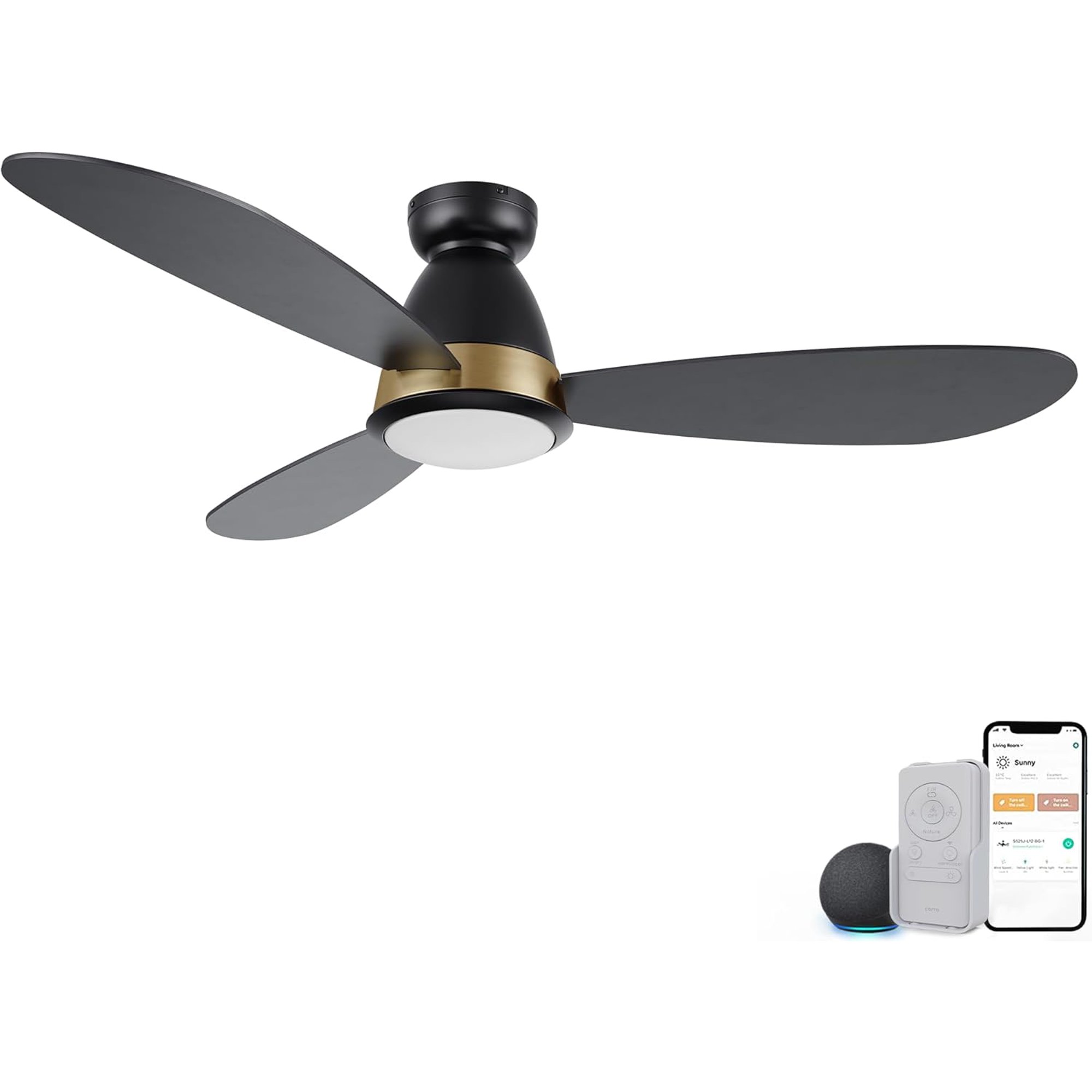 pingduo 52" Flush Mount Ceiling Fans with Lights and Remote Control,10-Speed Reversible Quiet DC Motor, Indoor Outdoor Smart Ceiling Fan Works with Smart APP/Alexa/Siri/Google, Black Gold