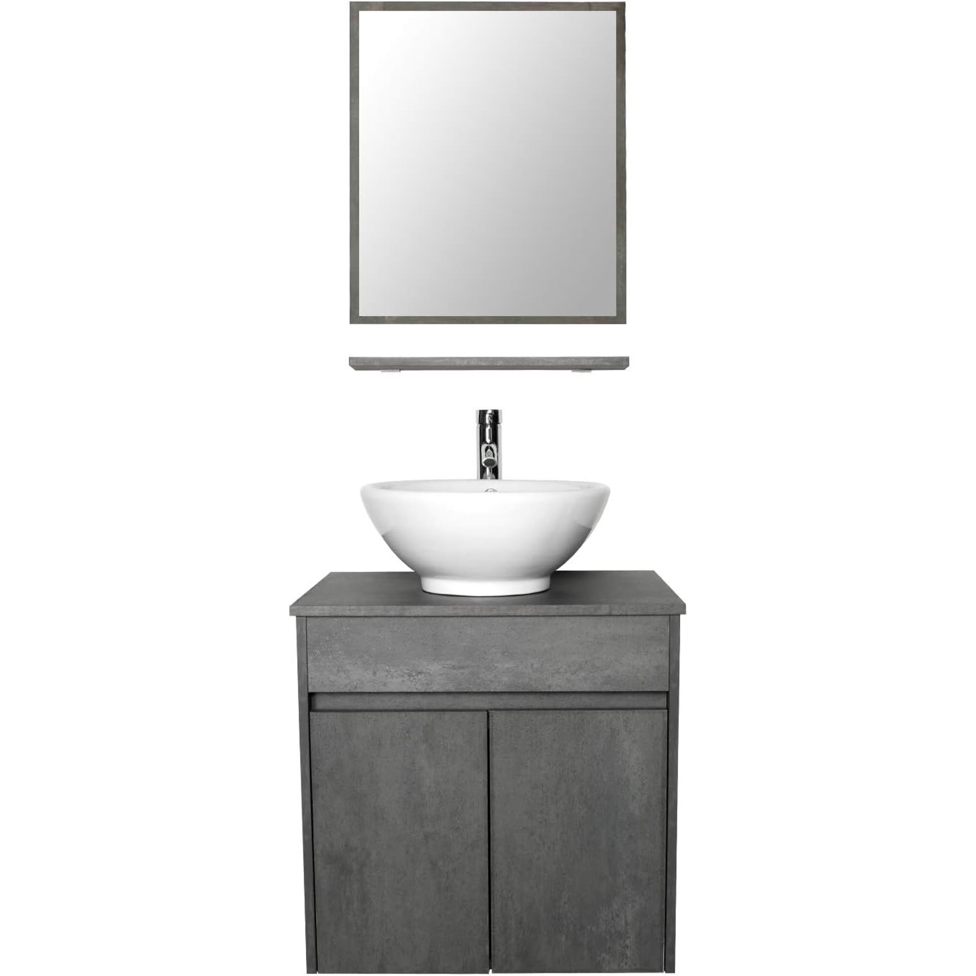 pingduo 24 Wall Mounted Bathroom Vanity and Sink Combo,Concrete Grey Color Vanity Set,White Ceramic(Round) Vessel Sink Top,W/Polish Faucet,Pop Up Drain,Mirror Inc