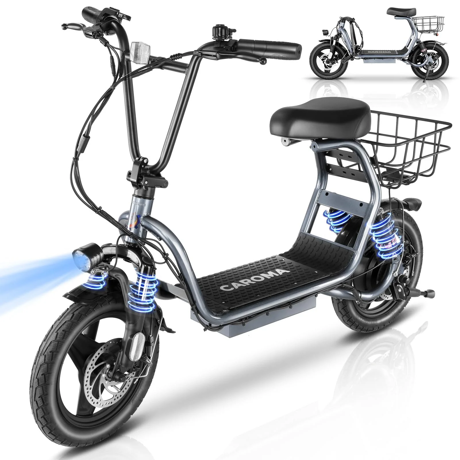 Caroma Electric Scooter with Seat for Adult, 500W Peak Motor up to 15 Miles Range & 20Mph, 14" Pneumatic Tire Foldable Scooter with Seat & Carry Basket, Gray
