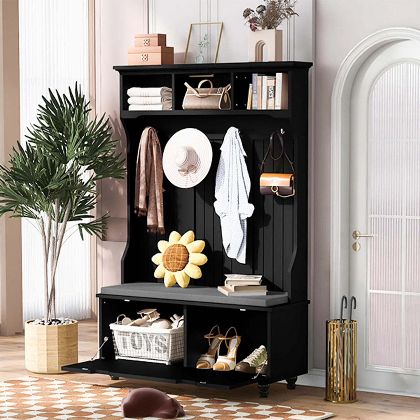Juiluna 40 Inch Hall Tree With Storage Bench, Accent Coat Tree With Storage Shelves, Entryway Bench With Coat Rack, Cabinet And Drawers For Hallway, Mudroom