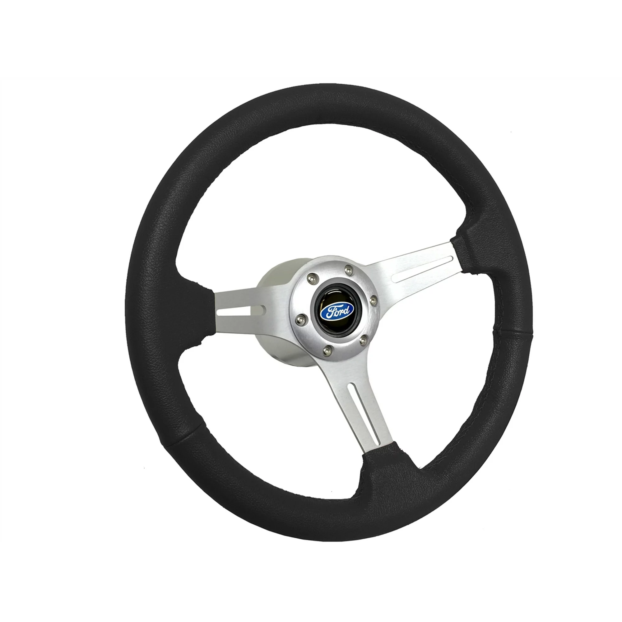 1968-91 Ford Passenger/Truck; VSW S6 Black Leather Wrapped Steering Wheel Brushed Aluminum Kit with Classic Blue Oval Emblem