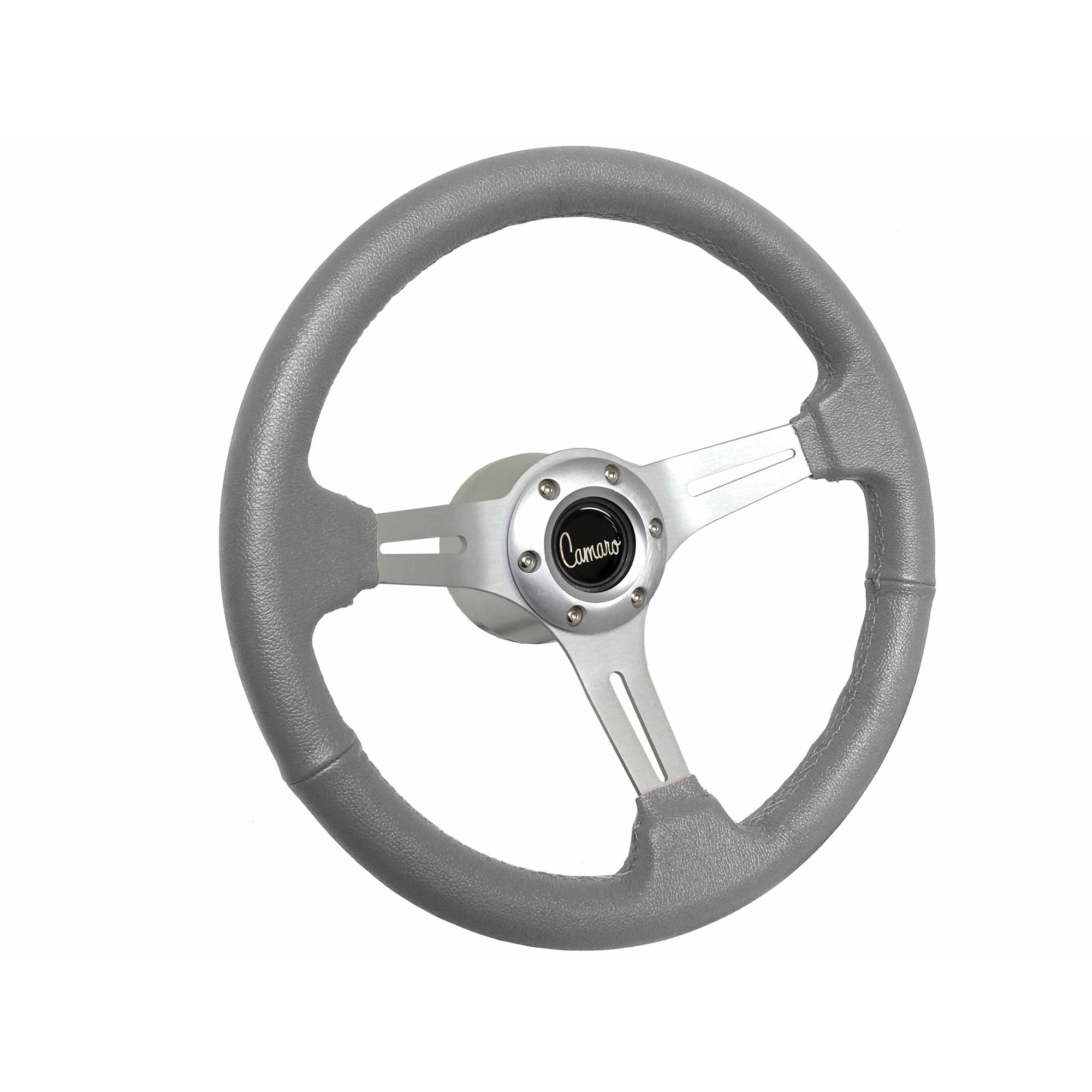 1969-1989 Camaro; VSW 6 Bolt Gray Leather Wrapped Steering Wheel Brushed Aluminum Kit, Script Emblem