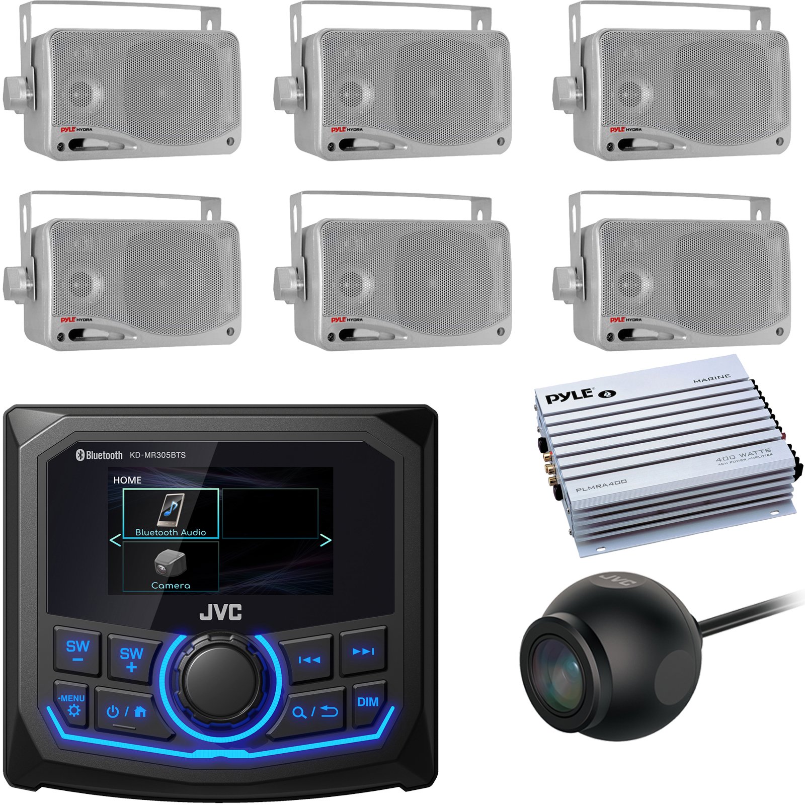 JVC KD-MR305BTS Marine MotorSports Digital Media Bluetooth USB AUX AM/FM Radio Receiver, 6x 3.5'' 200 Watts 3-Way Weather Proof Mini Box Speaker, 4 Channel Amplifier, Rear View Camera
