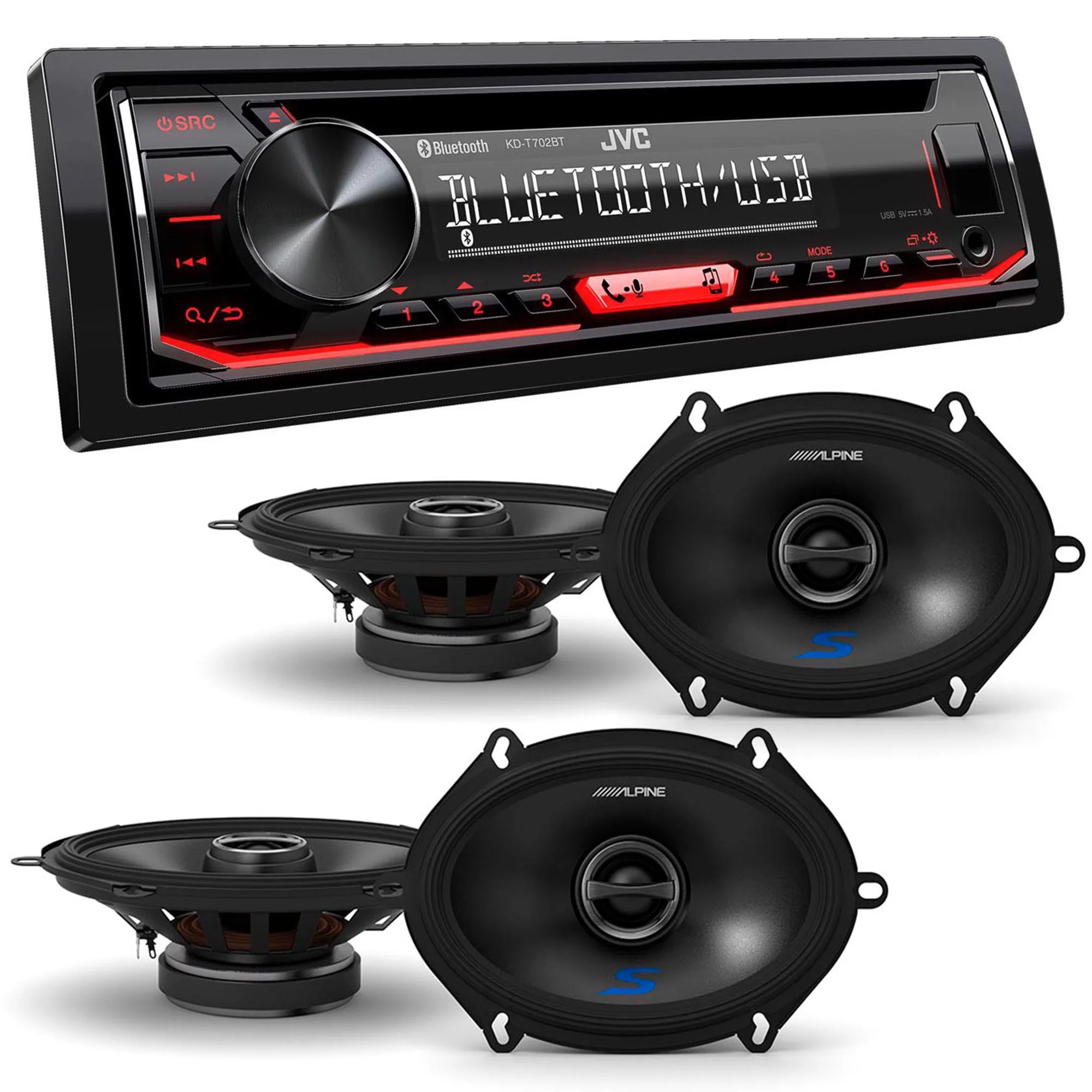 JVC KD-T720BT 1-DIN CD Receiver with Bluetooth Wireless Technology and USB/AUX Input with Alpine 2 Pairs S-S57 6x8/5x7" Coax Speakers