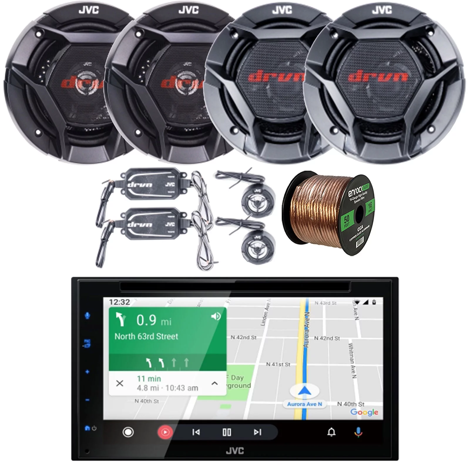 JVC KW-V660BT Double DIN AM/FM Stereo Bluetooth USB DVD Player Multimedia Receiver Bundle with 2x 6.75" 300W Shallow-Mount Car Speakers, 2x 6.5" 2-Way Coaxial 300W Automotive Speakers, Speaker Wire