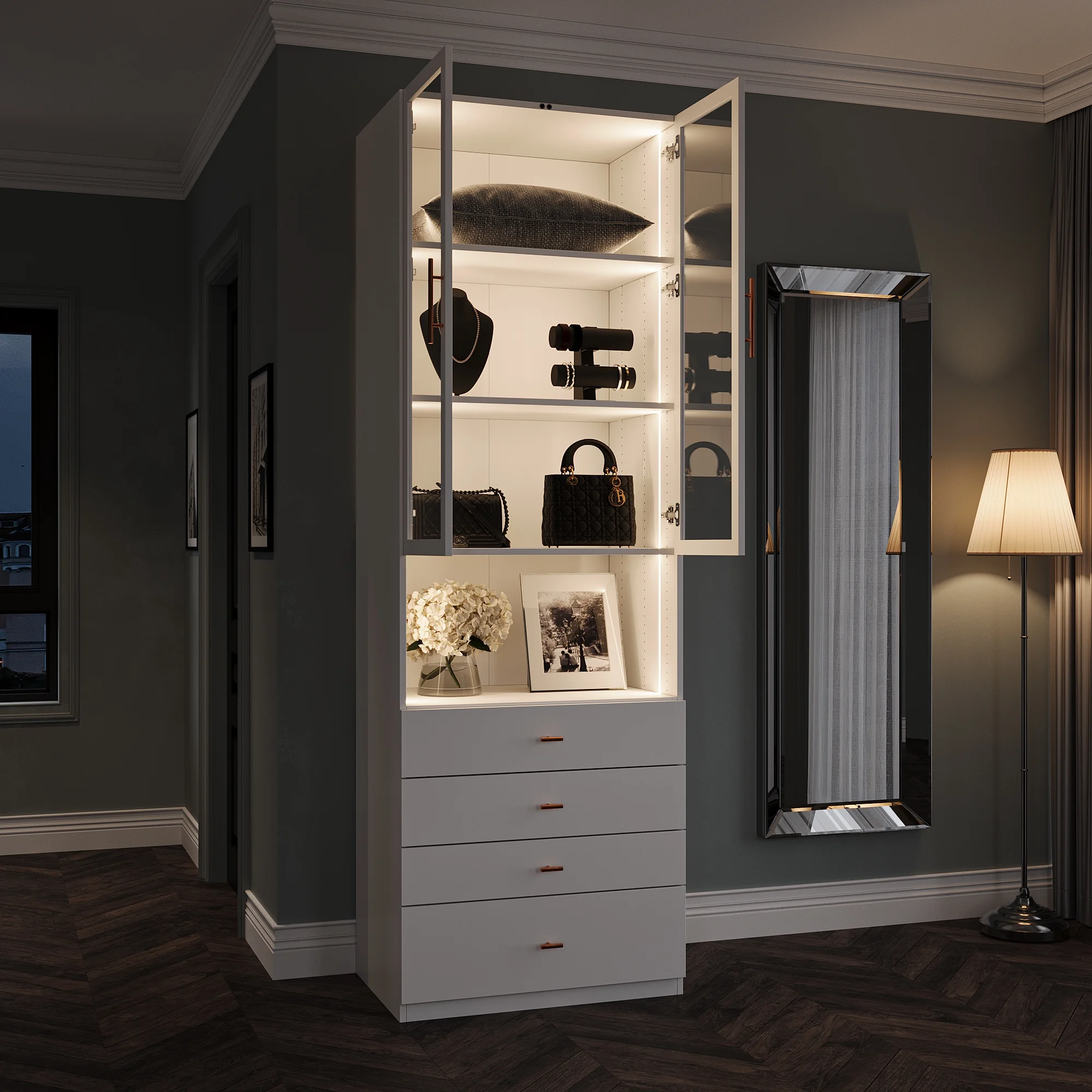 JY Furniture 95" Wood LED Closet System with Glass Doors, White (31.5"W x 95"H x 21.5"D)