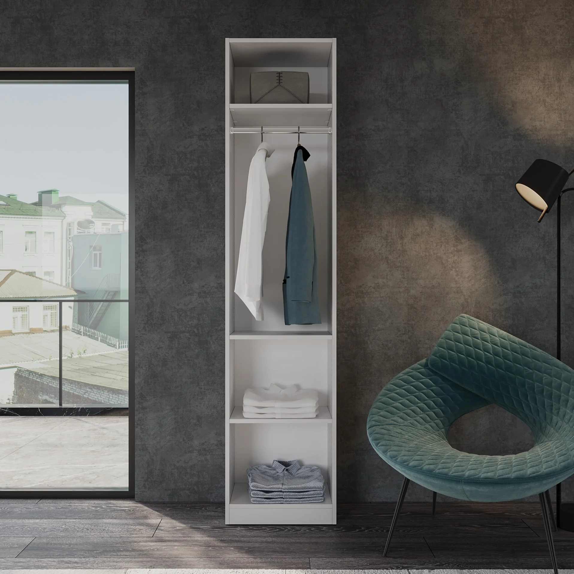 JY Furniture Wood Closet Organizer System, with 3 Adjustable Shelves, Hanging Rod, White (19.5"W x 85"H x 15"D)