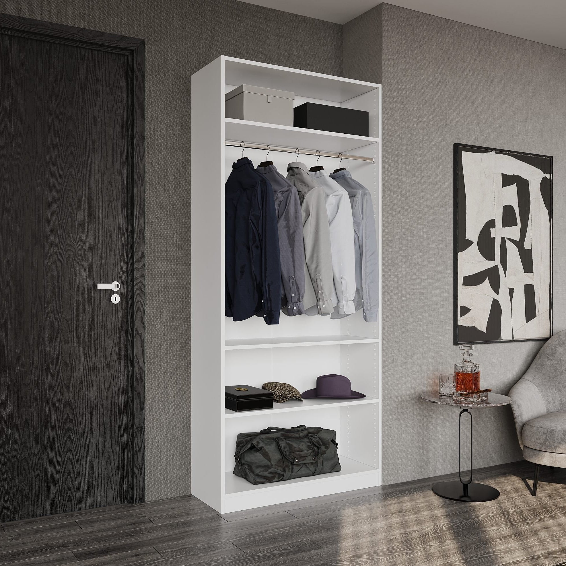 JY Furniture Wood Closet Organizer System, with 3 Adjustable Shelves, Hanging Rod, White (37.5"W x 85"H x 15"D)