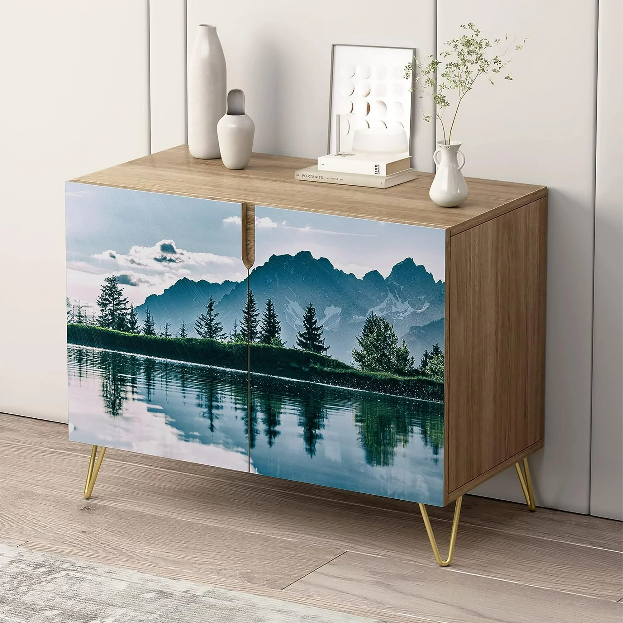 PixonSign Sideboard and Buffet Cabinet, 2 Doors Wood Storage Cabinet Console Table with Mountain Pine Tree Blue Sky Forestism for Kitchen, Bedroom, Dinning, Foyer, Office - 35" L x 18" W x 29" H