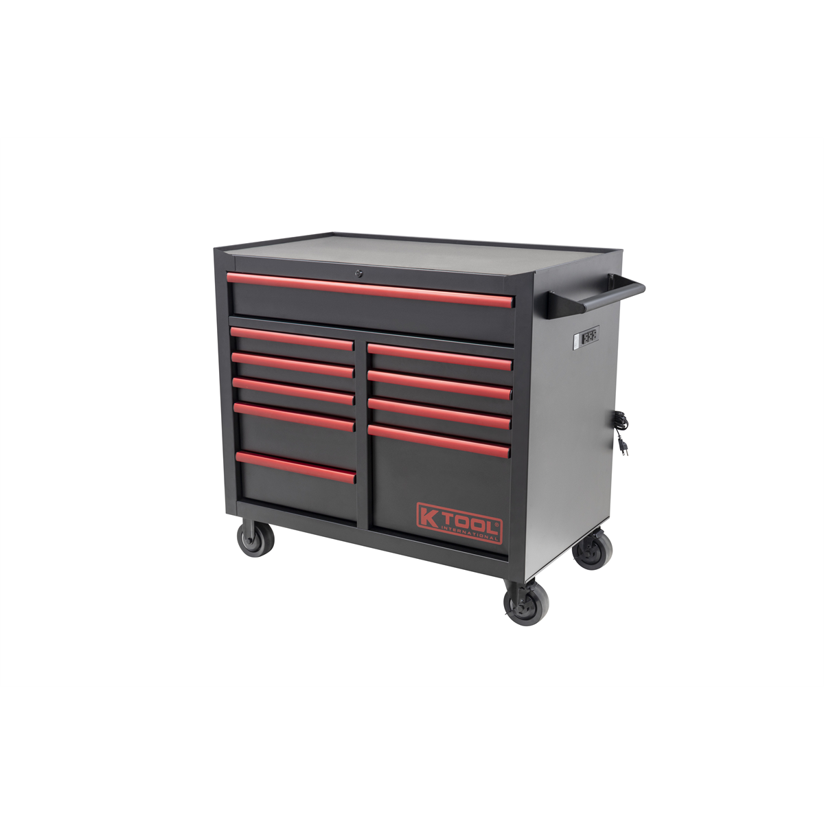 K Tool International 75132 41" Service Tool Cabinet for Garages, Repair Shops and DIY, (10) Drawer, Double Bay, 5" Swivel Casters, (2) with Brake, Integrated UL Power Strip, Fully Assembled, Black/Red