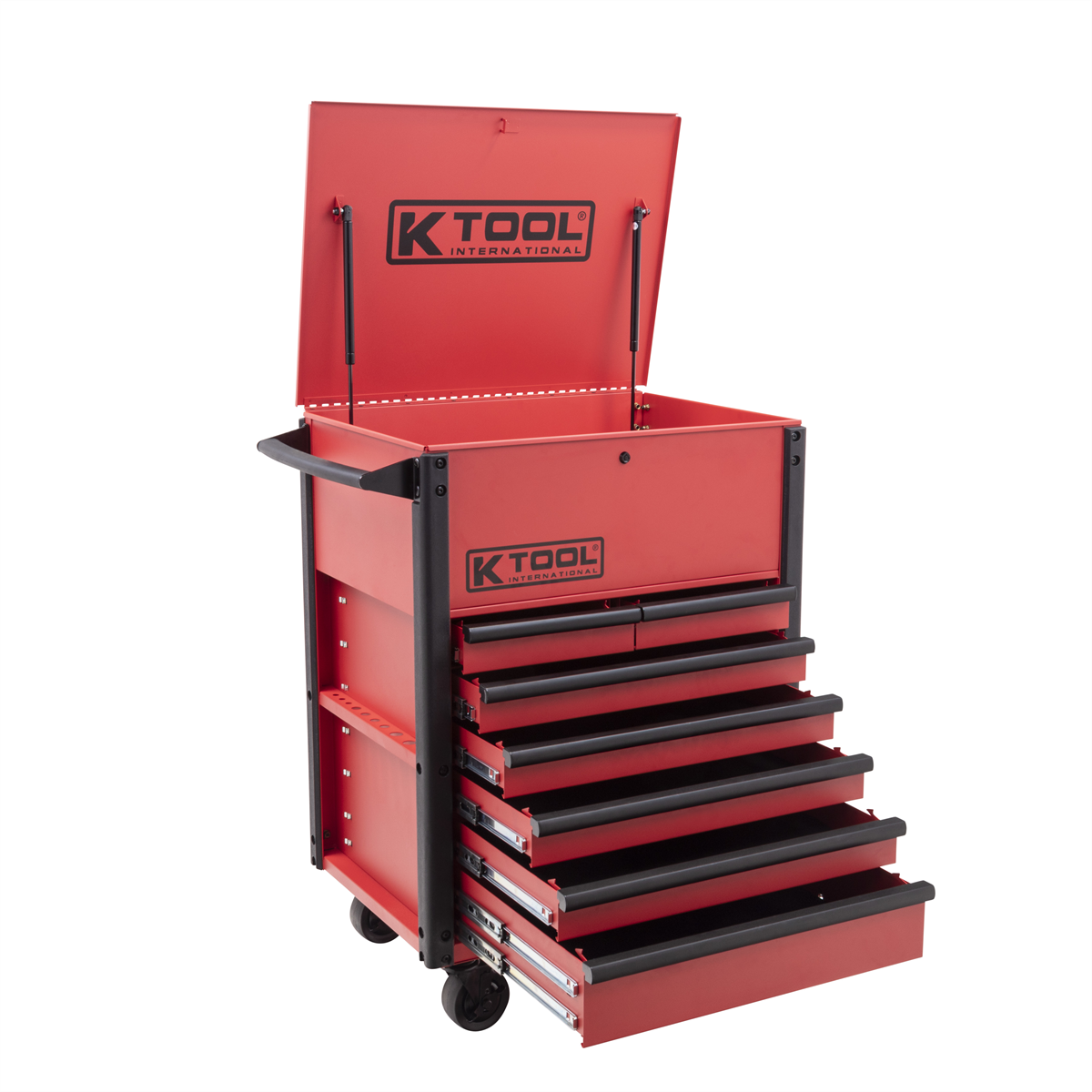 K Tool International 75123 35" Service Cart Tool Box for Garages, Repair Shops, and DIY, (7) Drawers, Locking Lid, (4) 5" Swivel Casters (2) with Brake, Protective Bumpers, Matte Finish, Red