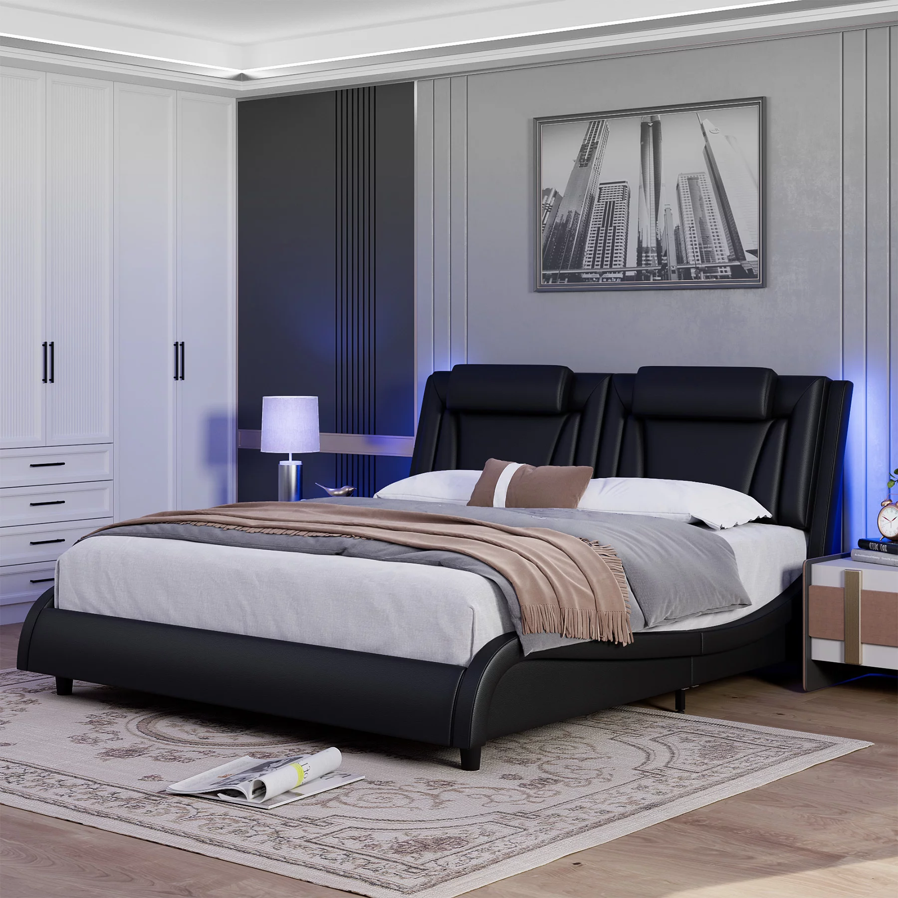 Homfa King Size LED Bed Frame, PU Leather Upholstered Curved Platform Bed Frame with Adjustable Headboard, Black