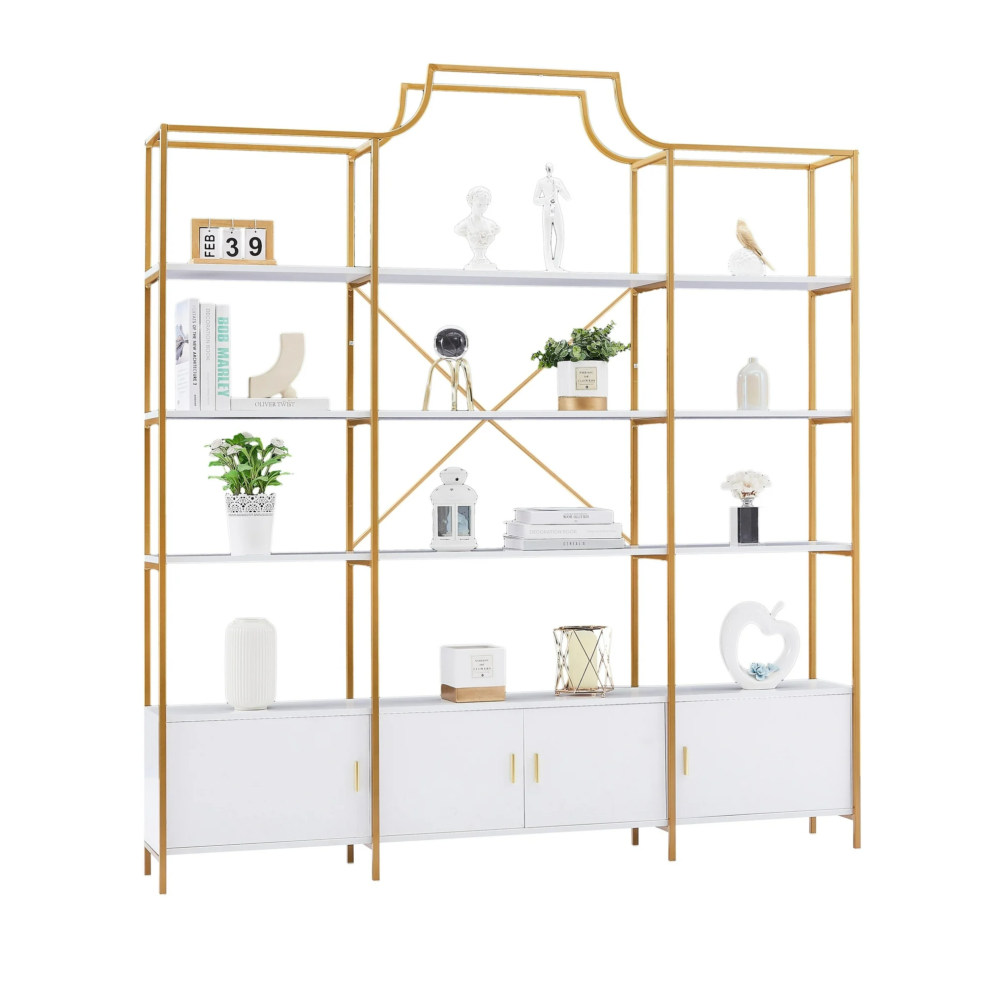 PORKISS 4 Tiers Bookcase Bookshelf, Modern Etagere Bookcase with Cabinets and X Bar Frame, Freestanding Tall Display Shelf for Home Office, Gold/White