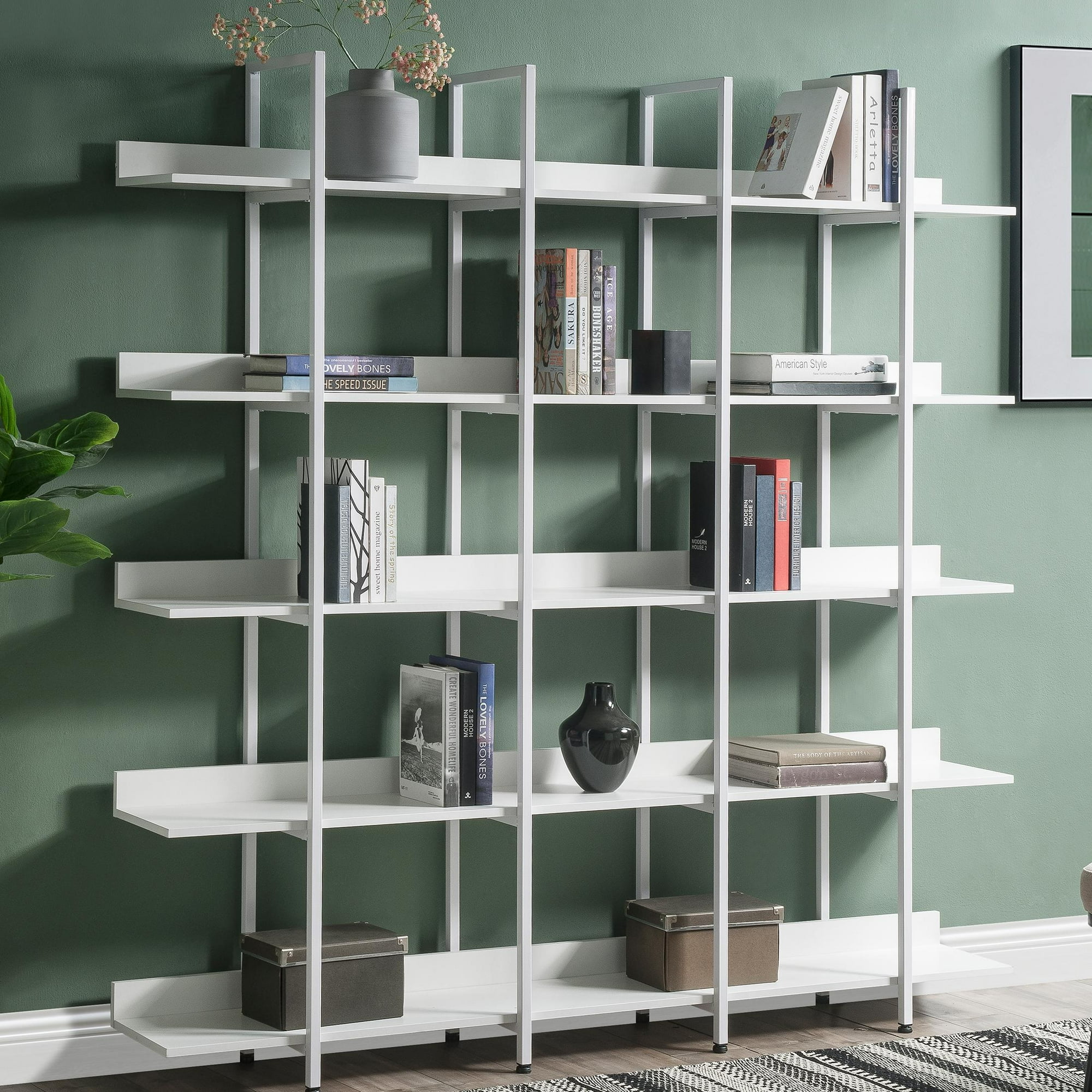 PORKISS 5 Tier Bookcase, Wood & Steel Open Bookshelf with Metal Frame, Vintage Industrial Style Tall Bookshelf with Open Storage, Modern Freestanding Etagere Bookcase for Home Office, White
