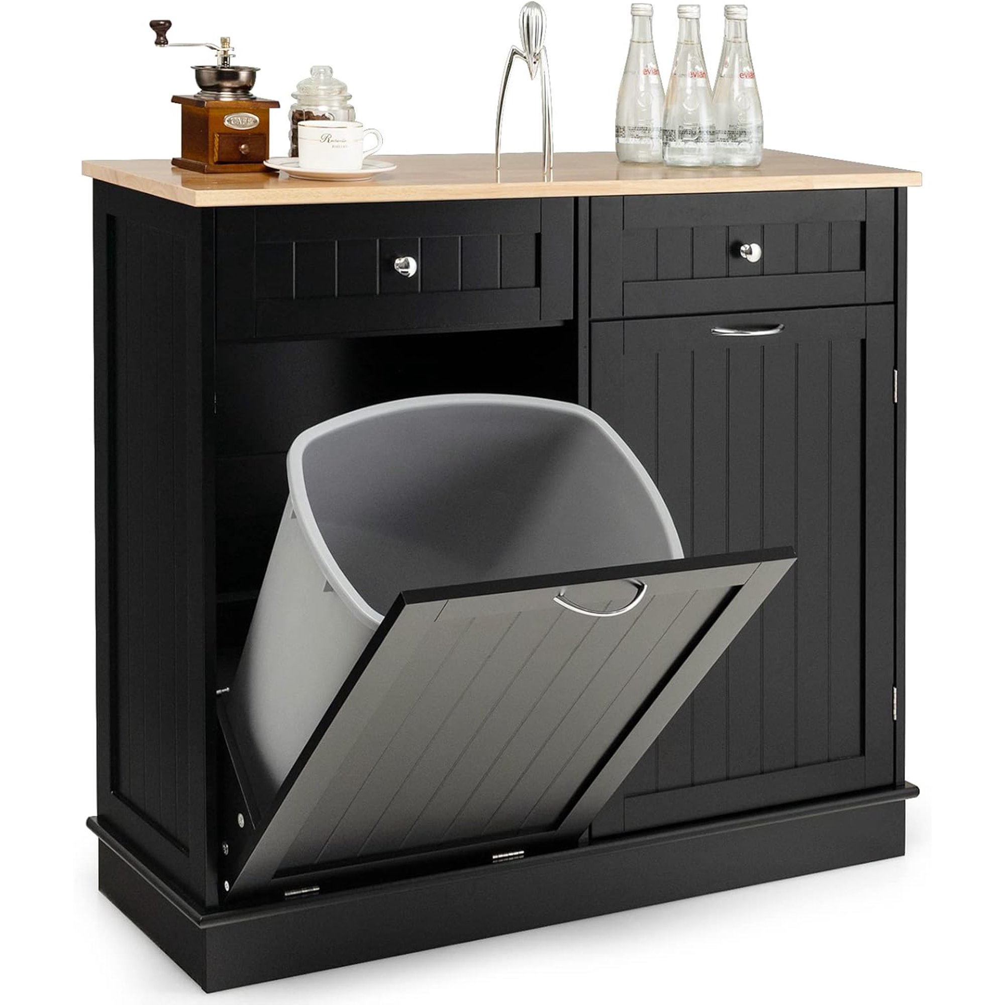 KEMANHUAN Kitchen Trash Cabinet, Kitchen Island with Tilt Out Garbage Bin, Rubber Wood Countertop, Large Cabinet, 2 Drawers, Adjustable Shelf, Recycling Can Holder Organizer (Black)